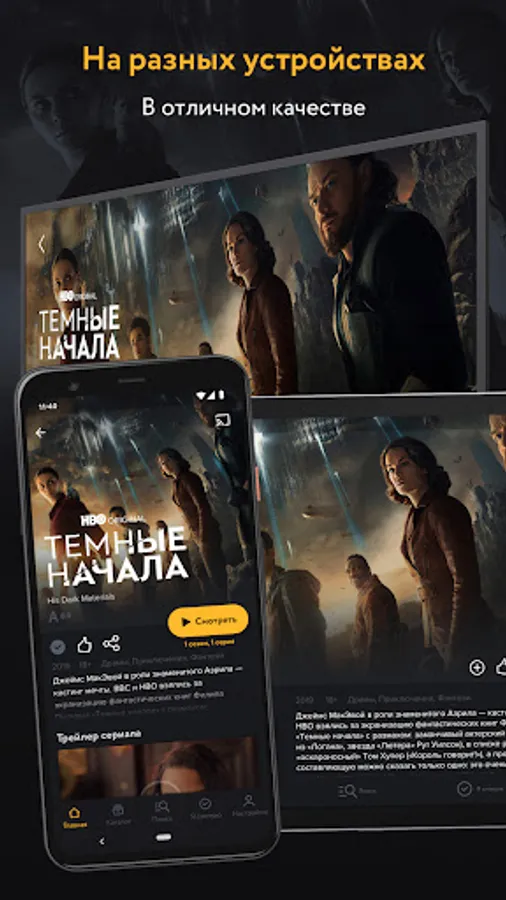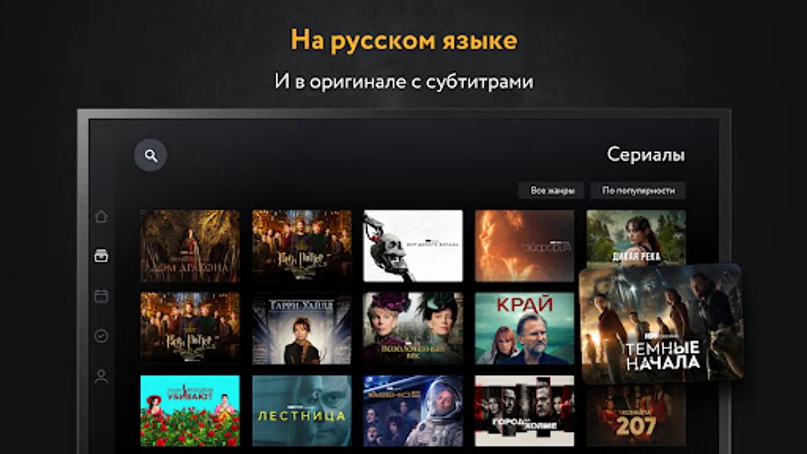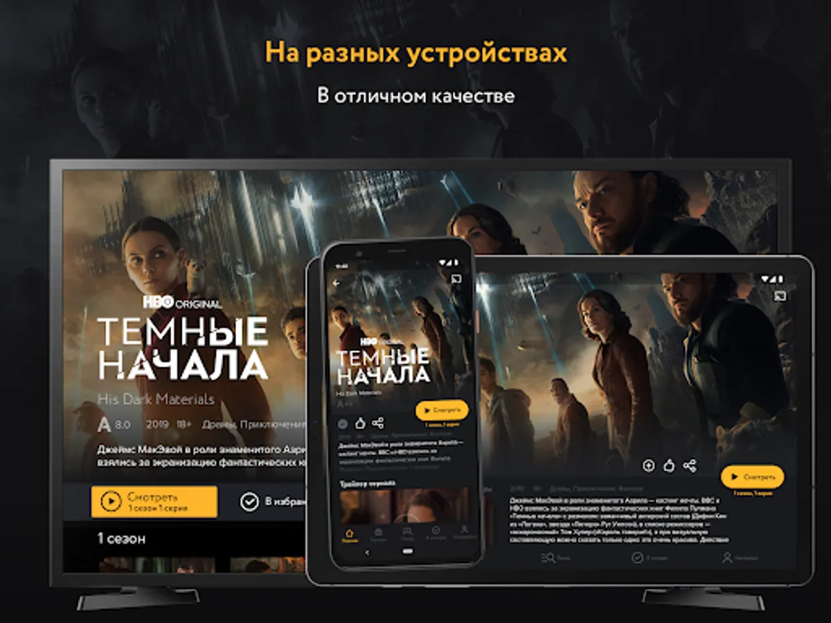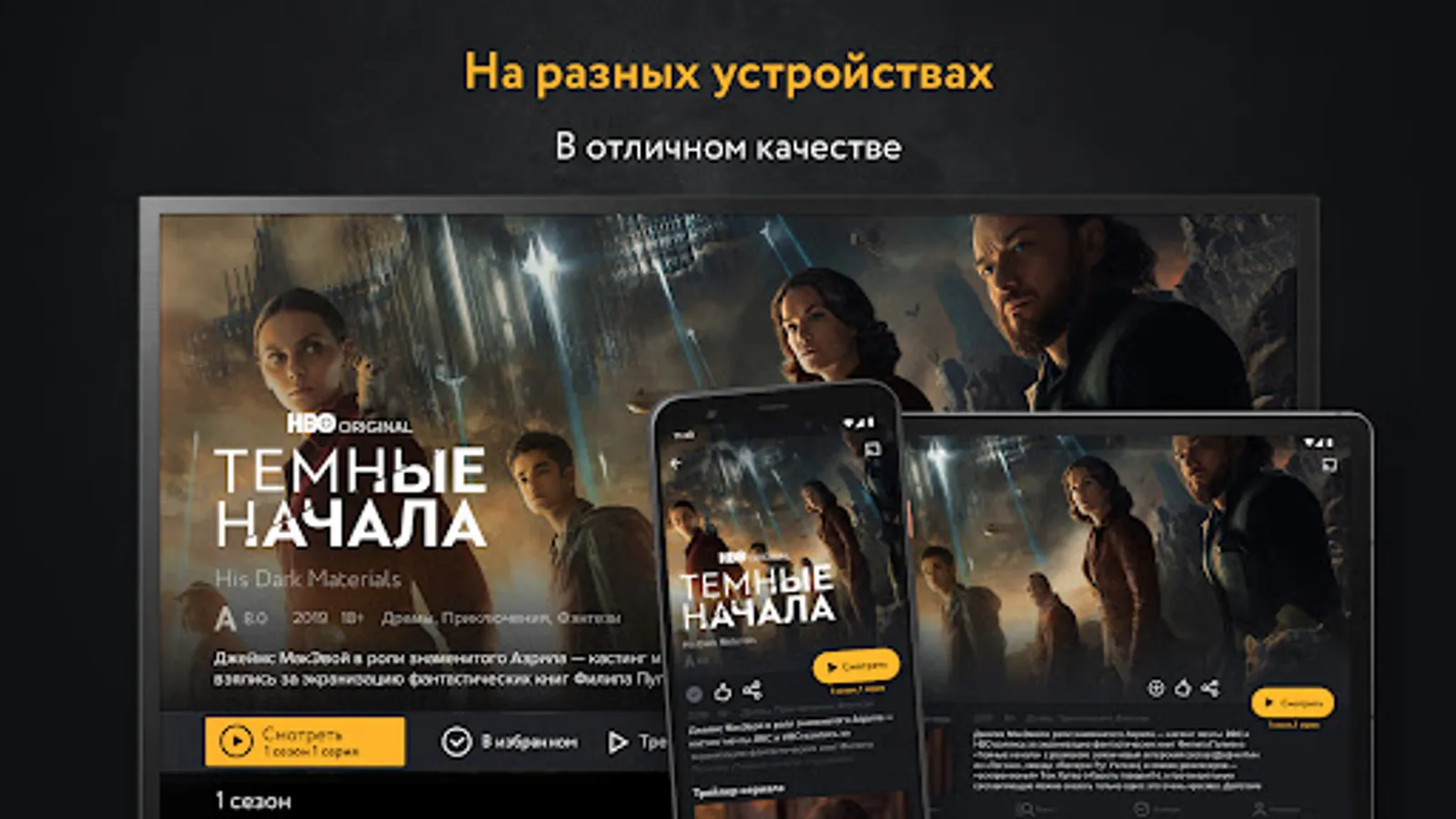 New projects and the entire library of HBO movies and series, hits from the world's leading TV channels and studios (HBO, HBO Max, FOX, Showtime, Starz, BBC, CBS, Sony Pictures) are waiting for you. New Russian series. A collection of feature films, documentaries, comedy films and series, dramas, fantasy films, concerts and stand-up shows.