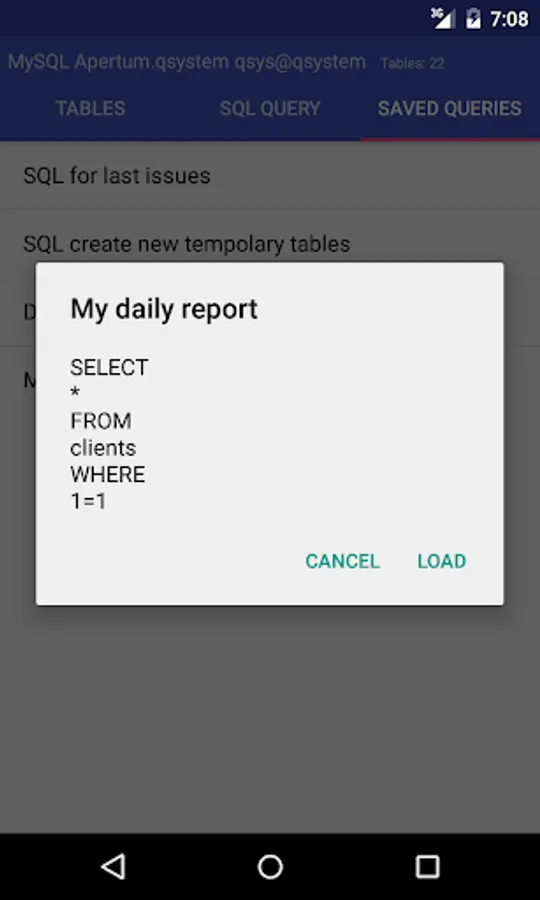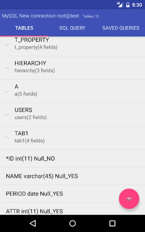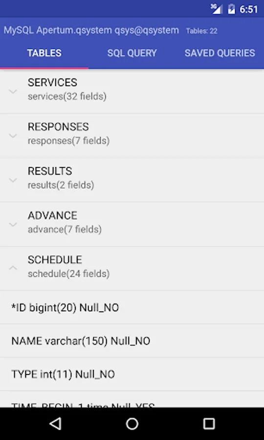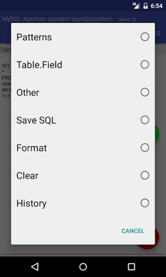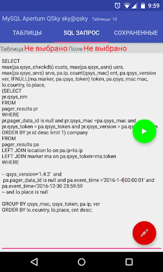 - Go to "SQL query" tab. Where are two round button and table+field for choosing. Choose table+field for easy forming SQL query. LONG TAP on buttons moves they and it can help you to make big queries.