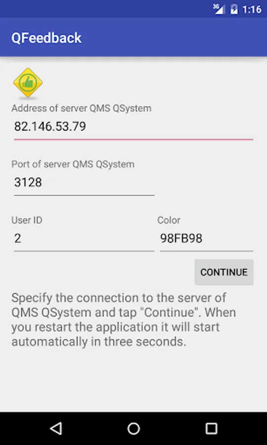 QFeedback application is simple to use. When you run will be asked to configure access to your QMS QSystem. By specifying the settings, tap button "Continue" and move to list of responses. On a next launches of the app, the transition to the list of responses will take place automatically in three seconds if you do not select one of the settings for editing. See the results of the feedback received in the standard reports of QMS QSystem.