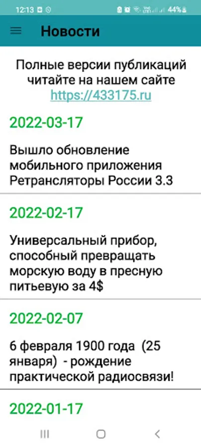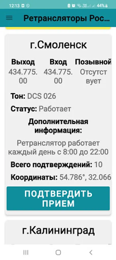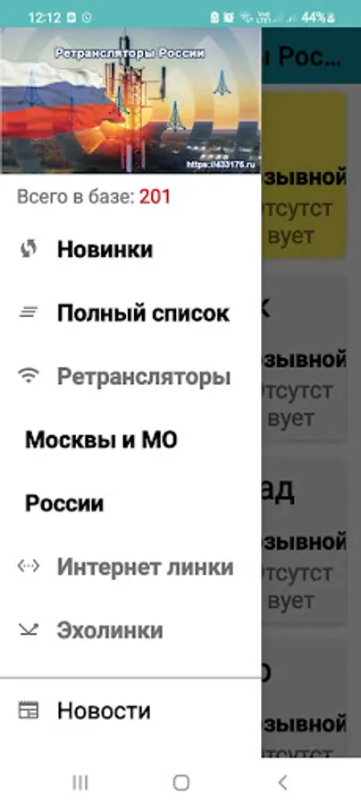 The application displays a list of repeaters, Internet links, echolinks of Russia from the largest database - the Russian FM project.