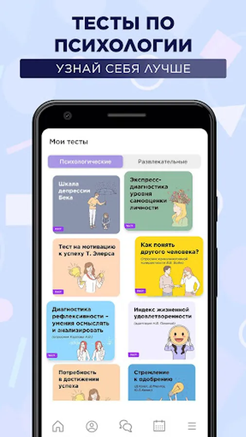 There is a separate selection of entertaining tests, for example, for the ability to listen to the interlocutor, for decisiveness and politeness, psychological tests with pictures, etc. In the future, we plan to add more than 40 psychological tests for introspection.