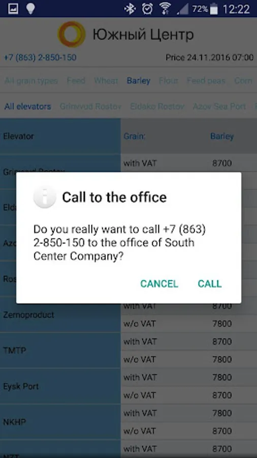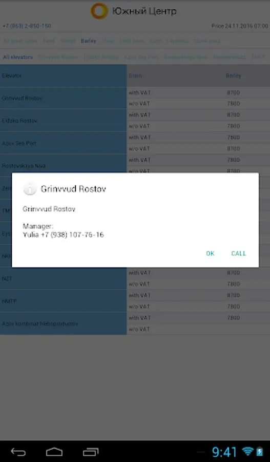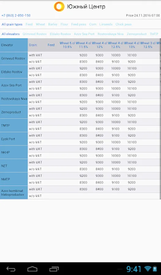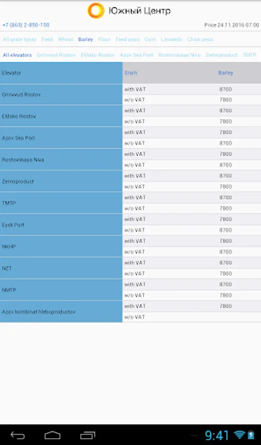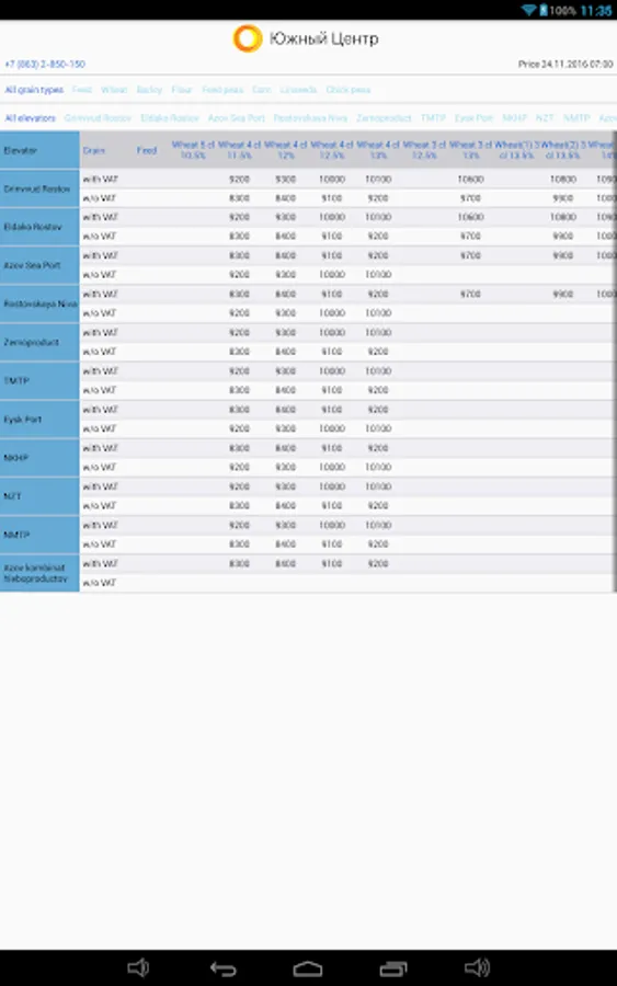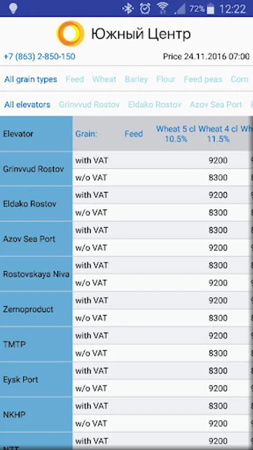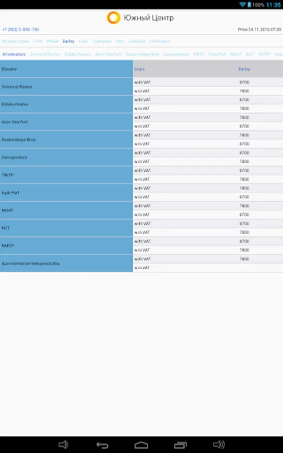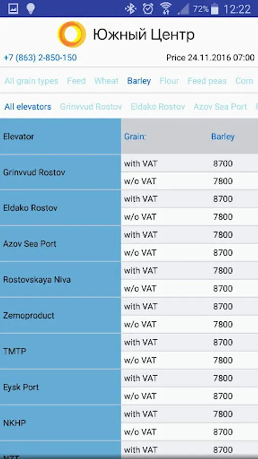 "South Center" is the largest buyer and exporter of agricultural crops in the South Russia. Using this application you can quickly find out the best purchasing prices for wheat, barley, corn, peas, flour, flax, etc. Get all the necessary information about the elevators, monitor price changes, contact the manager to sell your products.