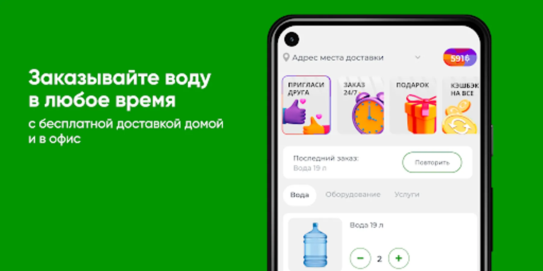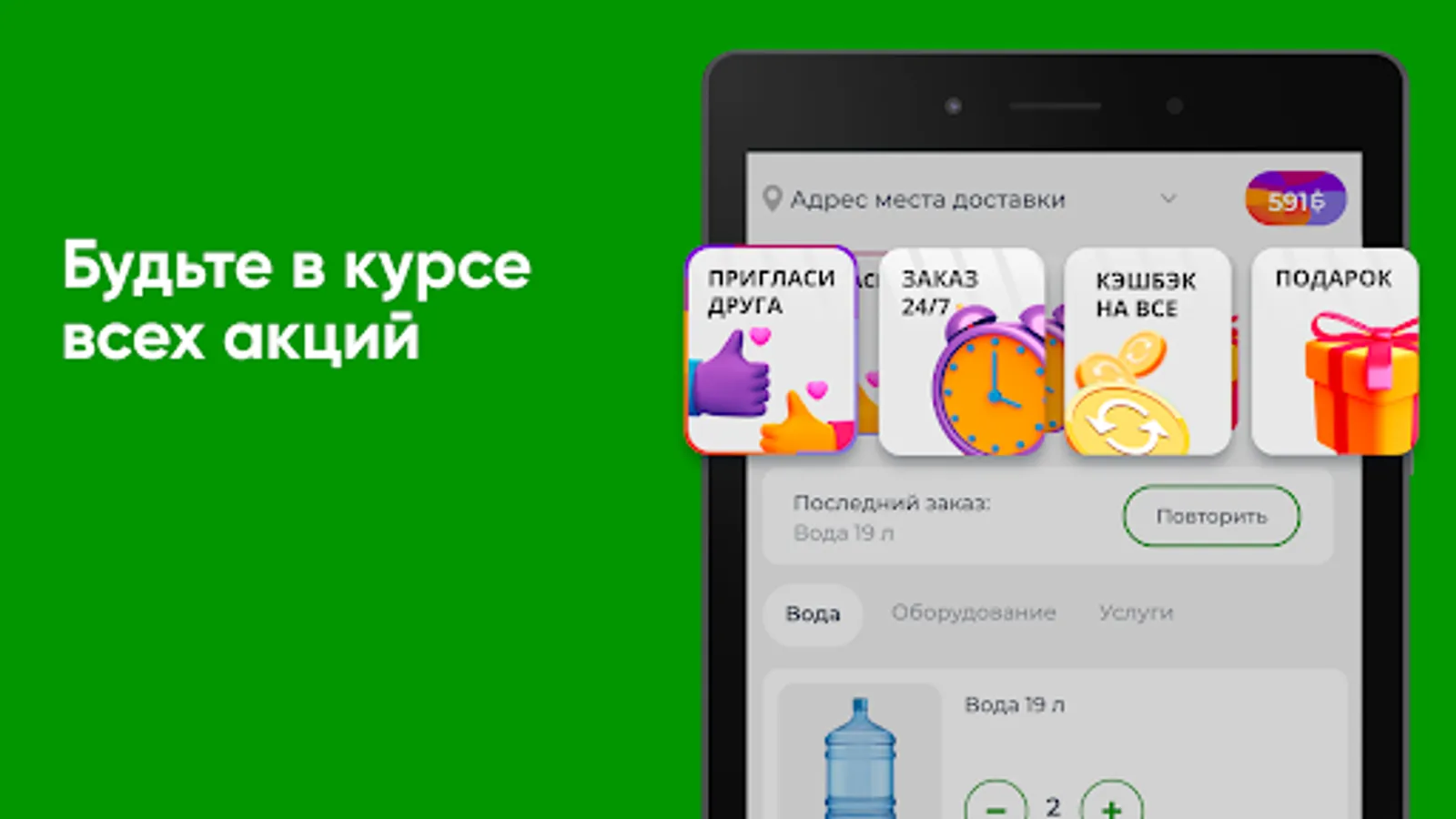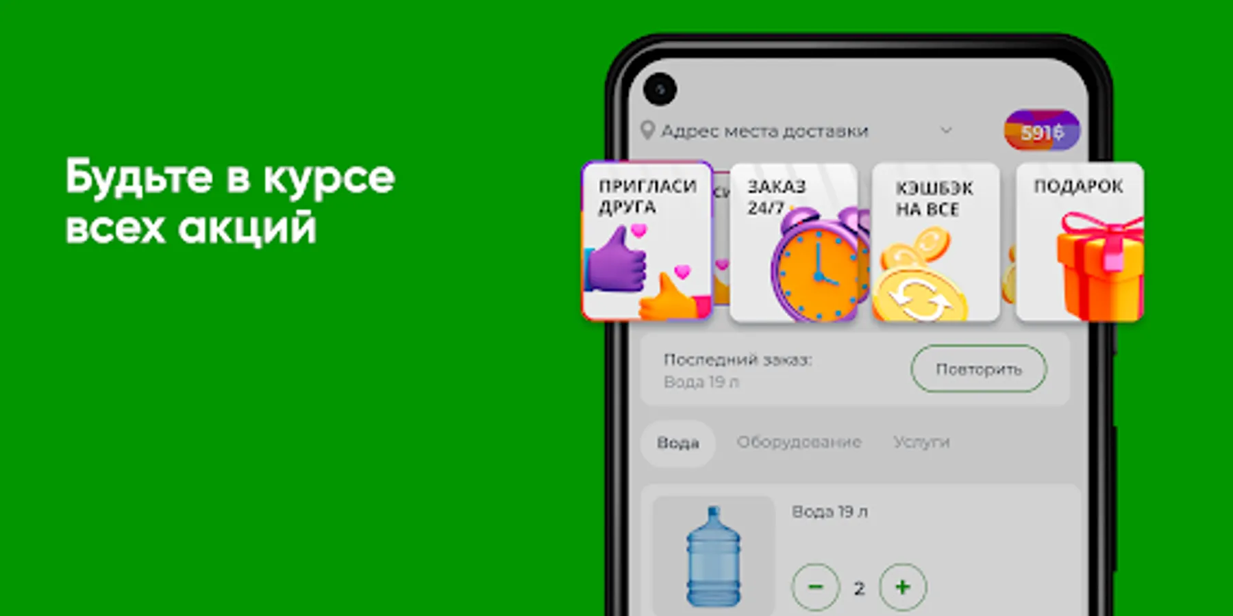 Download the Aquaflot app to your smartphone and order water 24/7. You will be able to repeat the order by pressing one button, see the entire history of purchases and be aware of all the company's promotions.