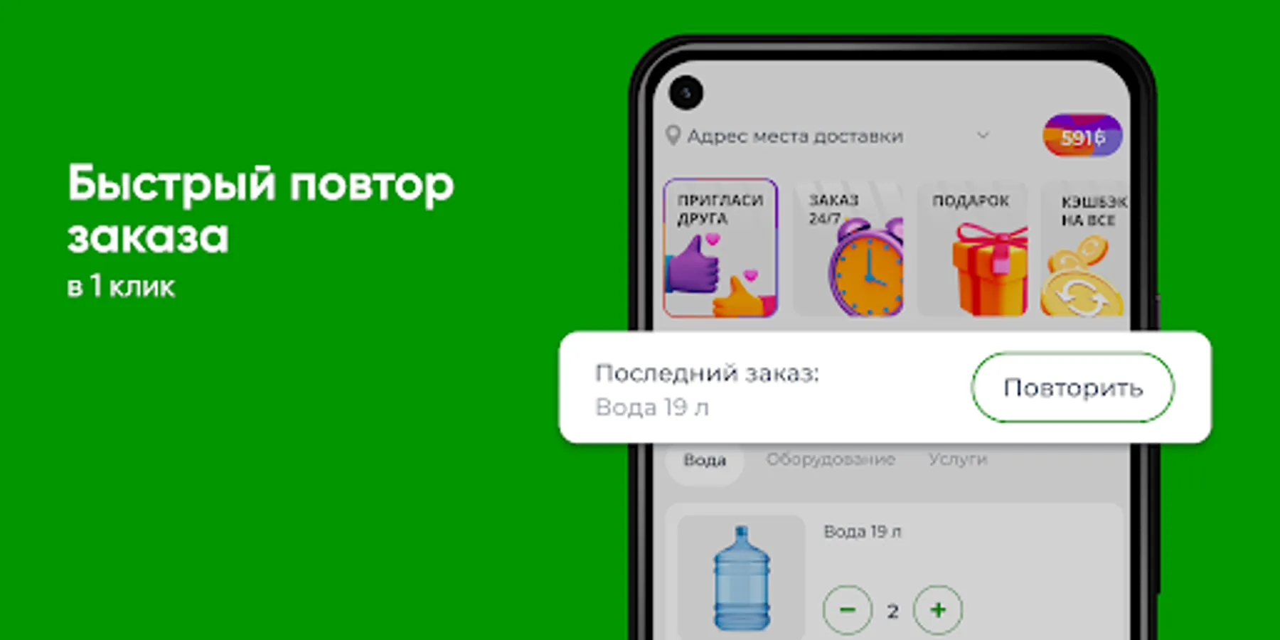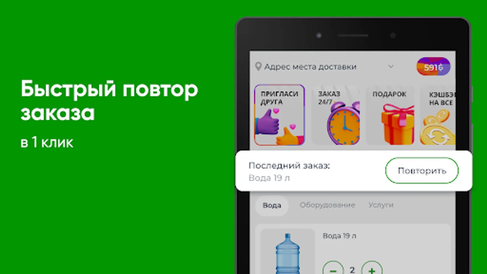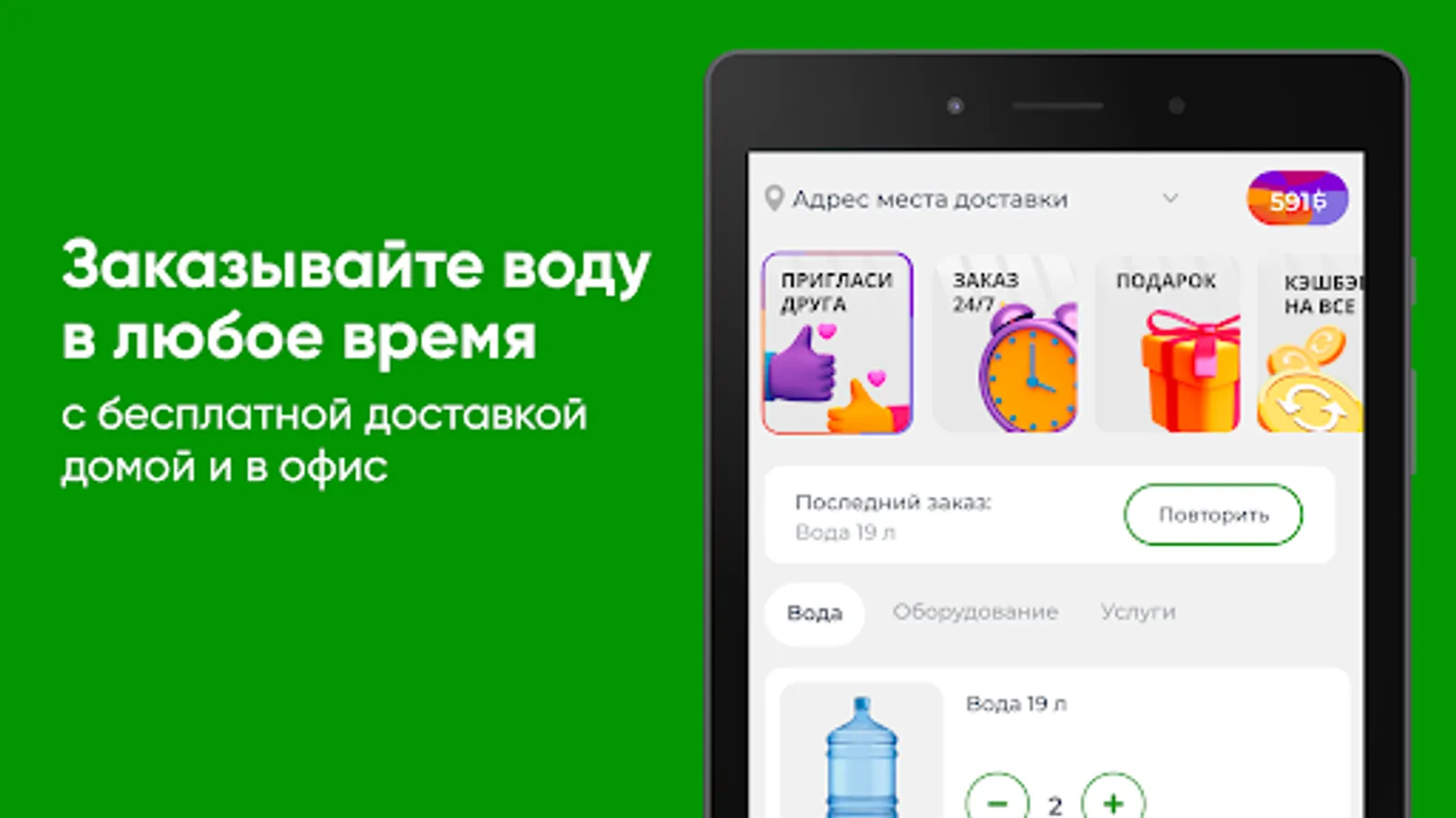 Download the Aquaflot app to your smartphone and order water 24/7. You will be able to repeat the order by pressing one button, see the entire history of purchases and be aware of all the company's promotions.
