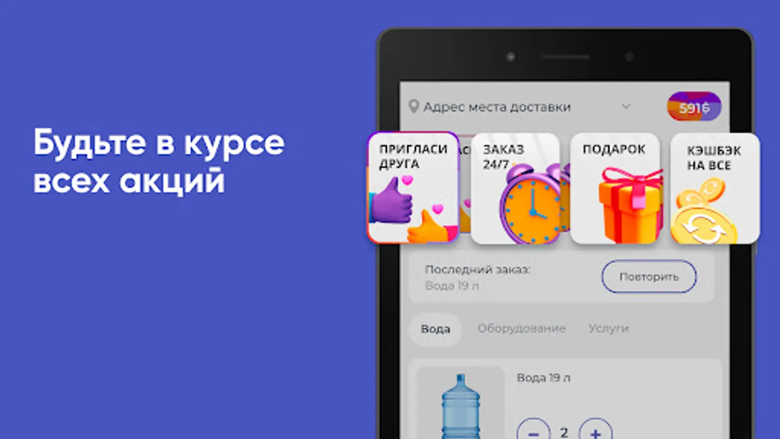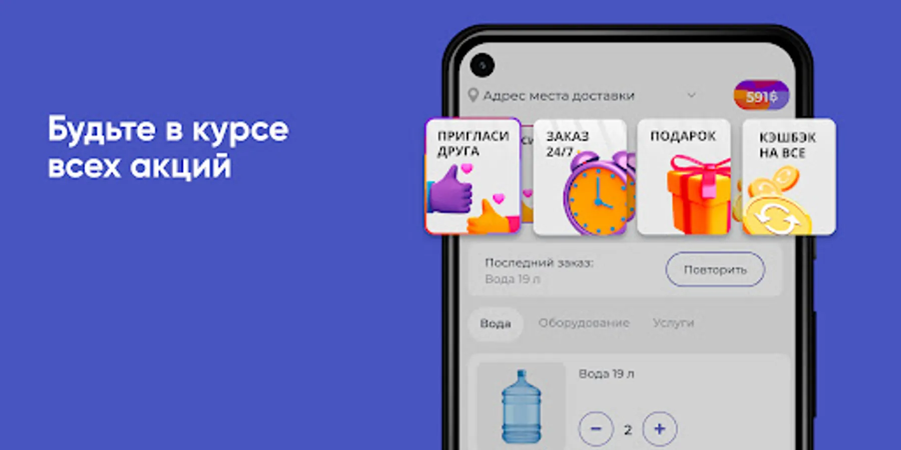Ordering water in the "Sterlitamak Red Key" application is simple and quick. All products are collected by category. Add the desired items to the cart and place an order at any time of the day.