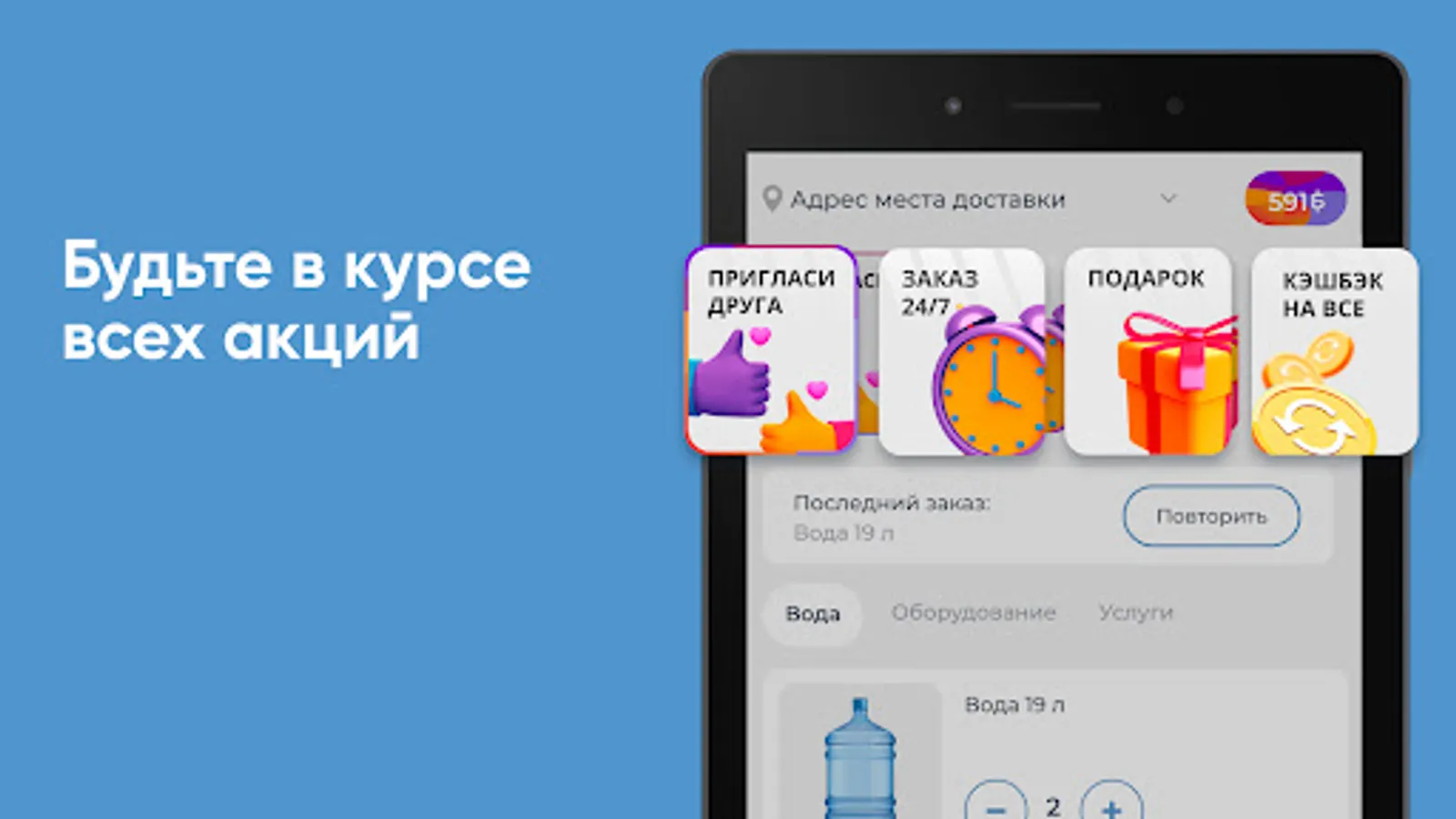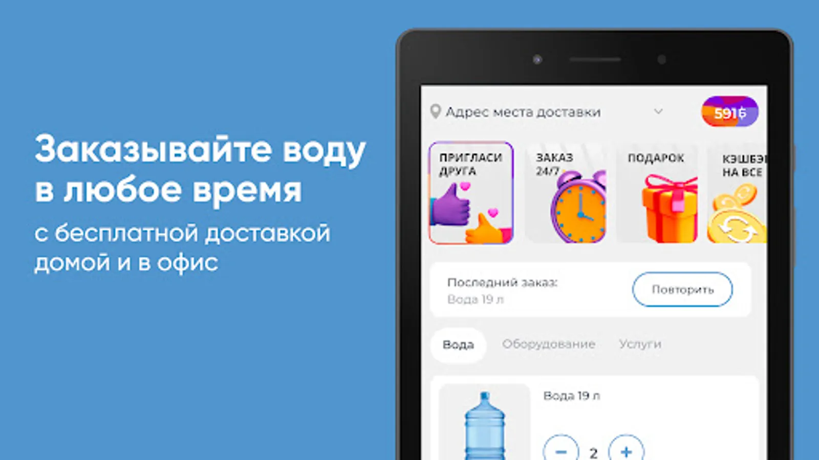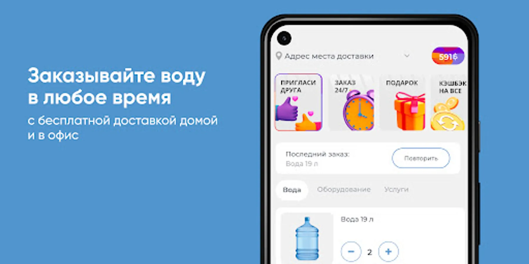 Download the "GORNAYA Makhachkala" application on your smartphone and order water 24/7. You will be able to repeat the order with the click of a button, see the entire purchase history and keep abreast of all the company's promotions.