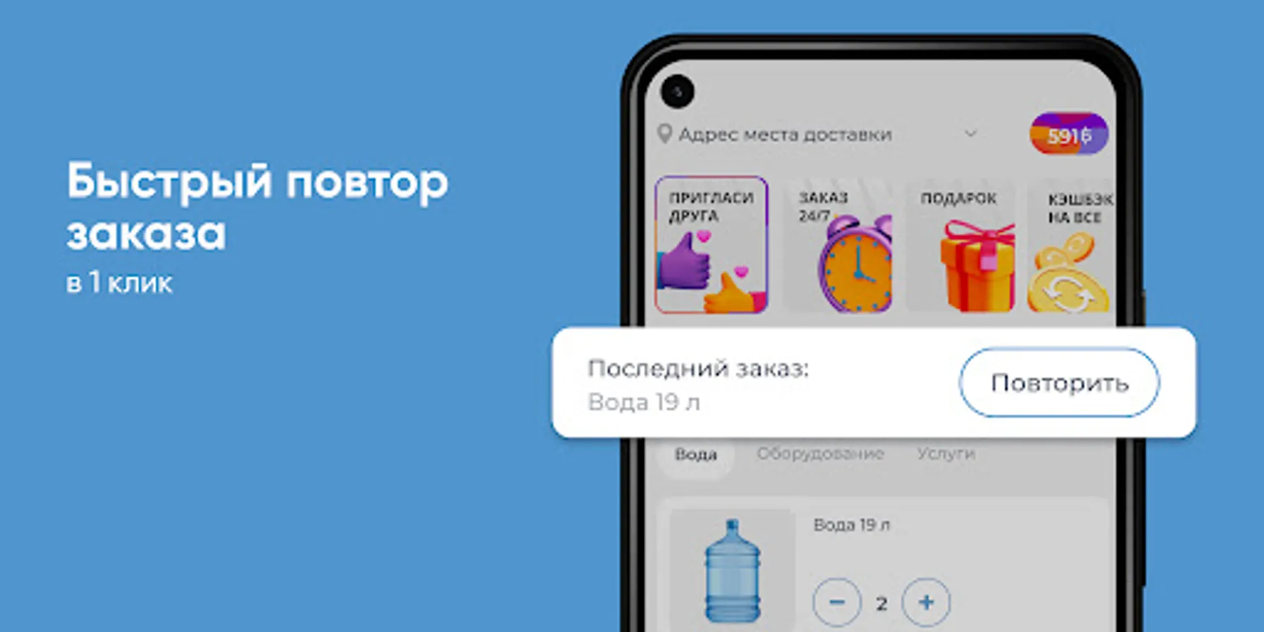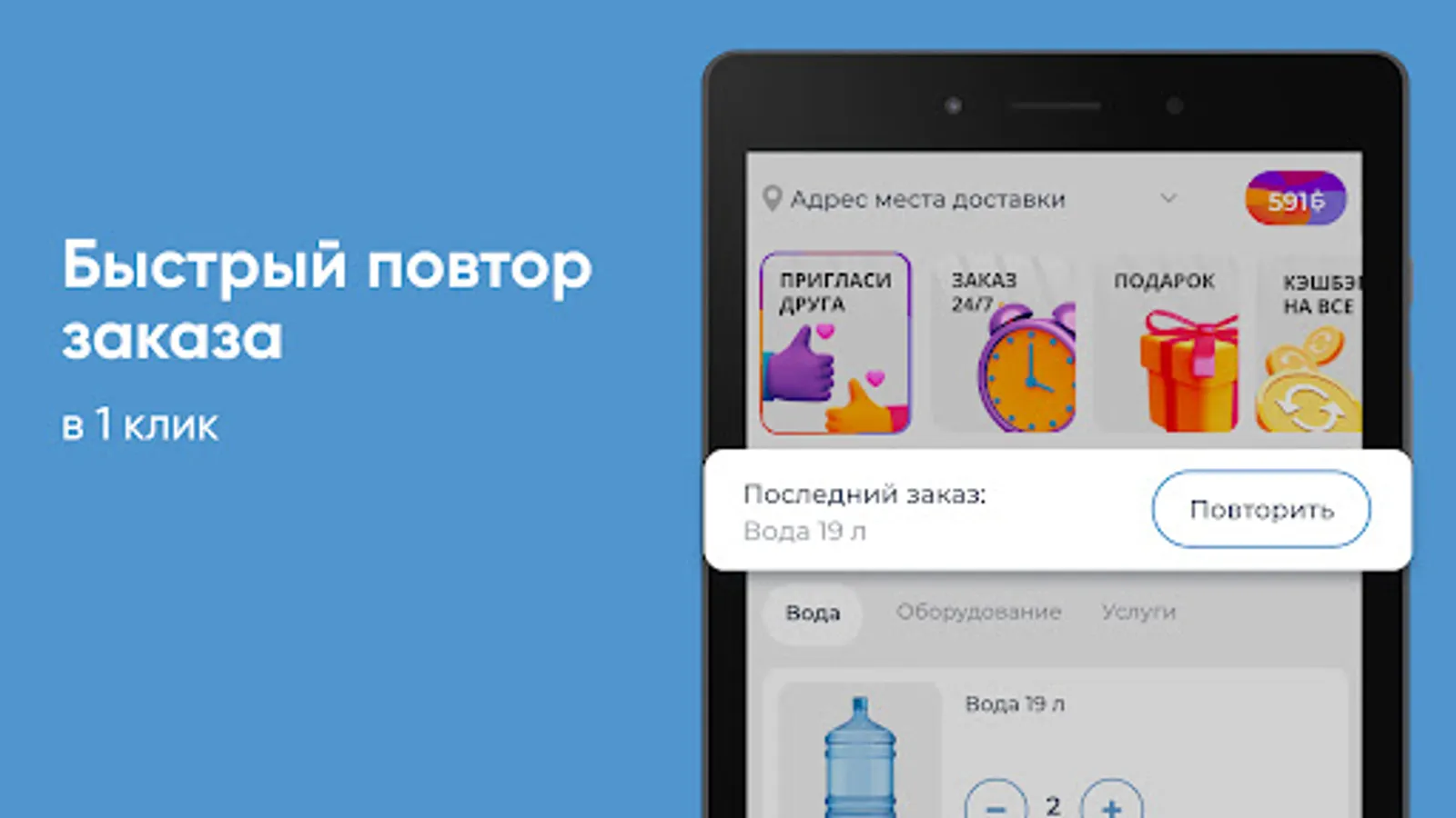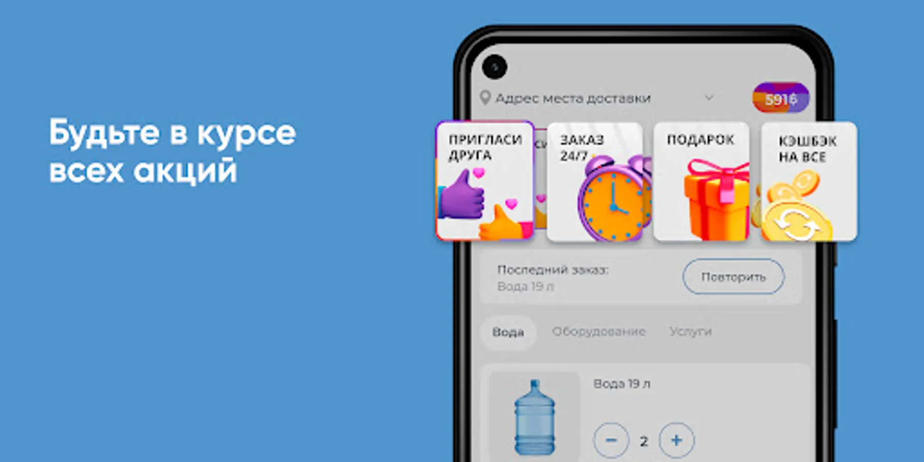 Download the "GORNAYA Makhachkala" application on your smartphone and order water 24/7. You will be able to repeat the order with the click of a button, see the entire purchase history and keep abreast of all the company's promotions.