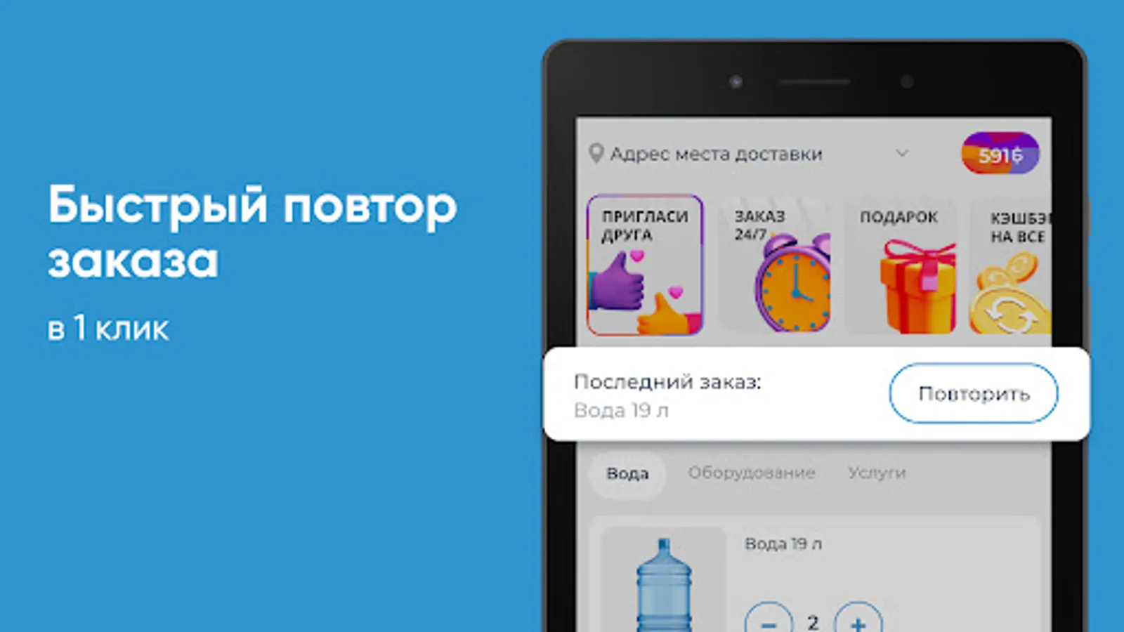 Ordering water in the "Sterlitamak Red Key" application is simple and quick. All products are collected by category. Add the desired items to the cart and place an order at any time of the day.