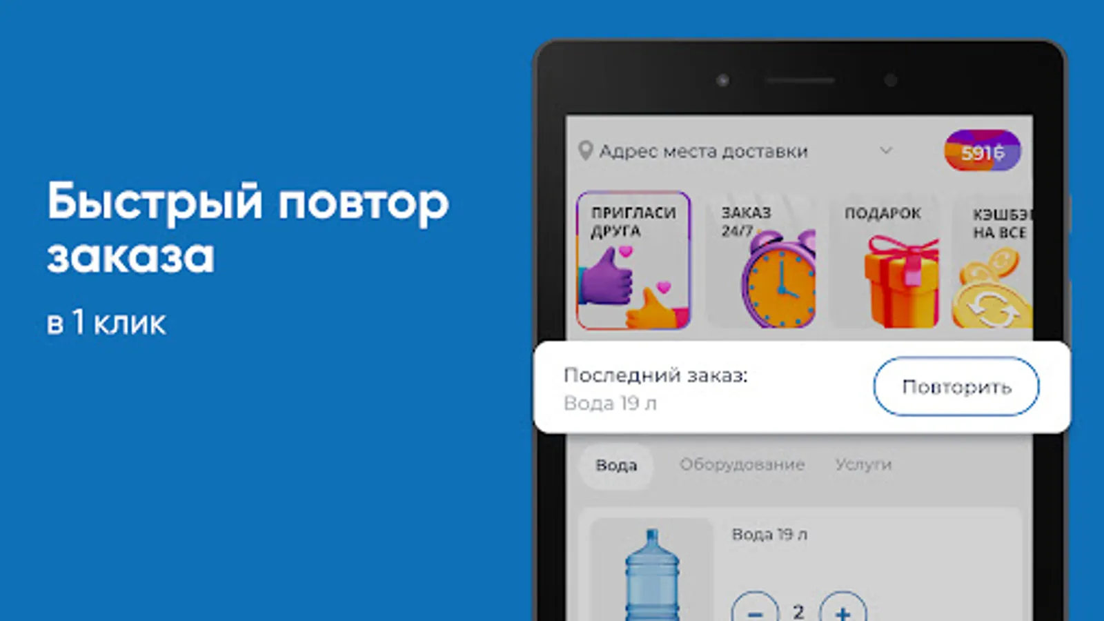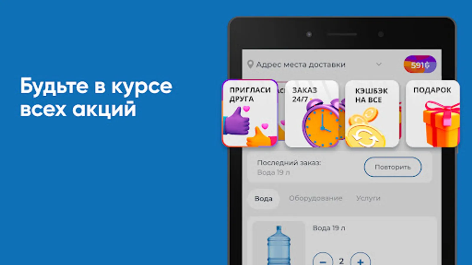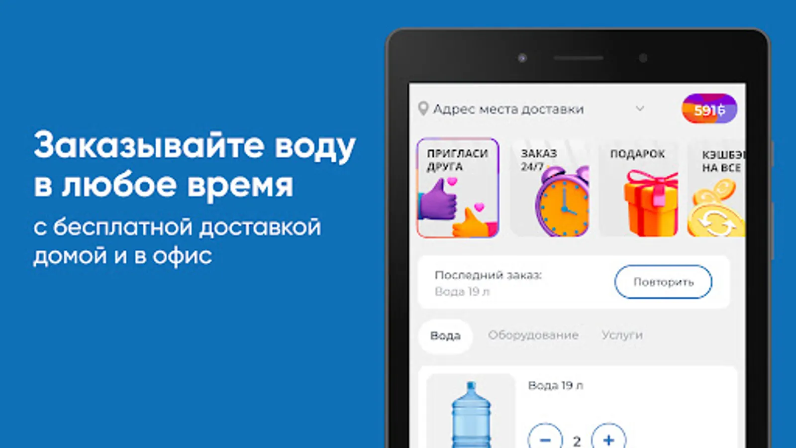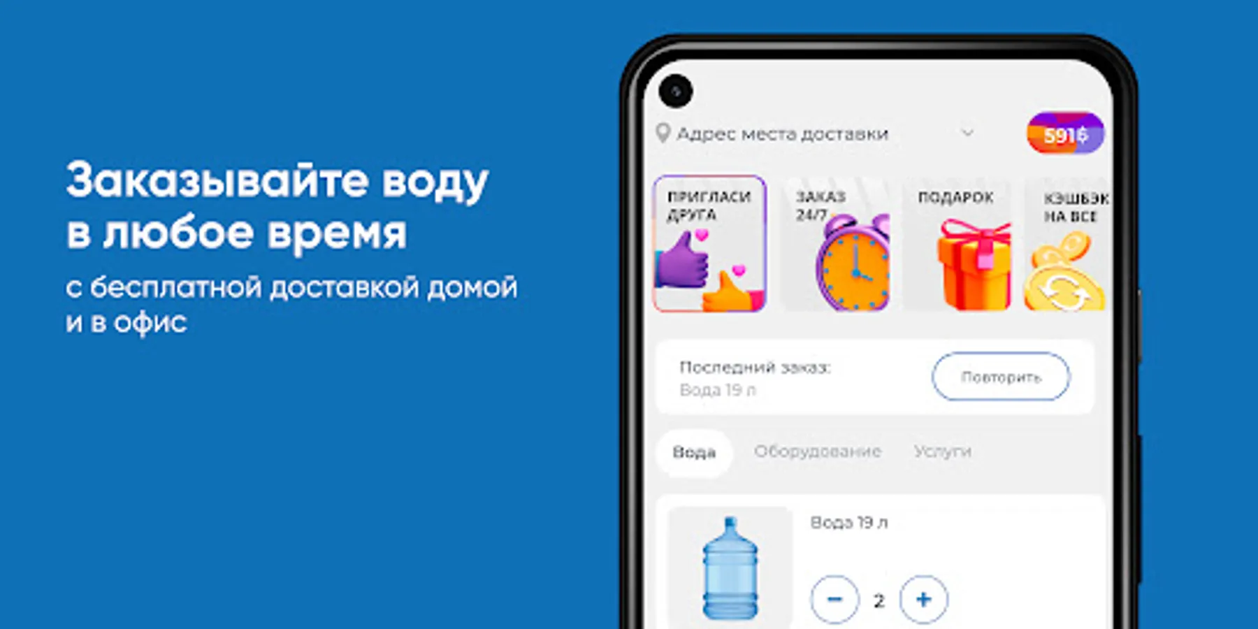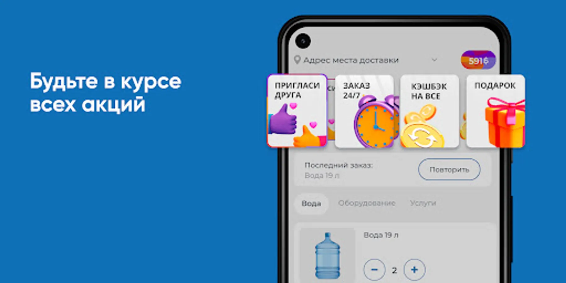 Download the Holy Key app on your smartphone and order water 24/7. You will be able to repeat the order by pressing one button, see the entire history of purchases and be aware of all the company's promotions.