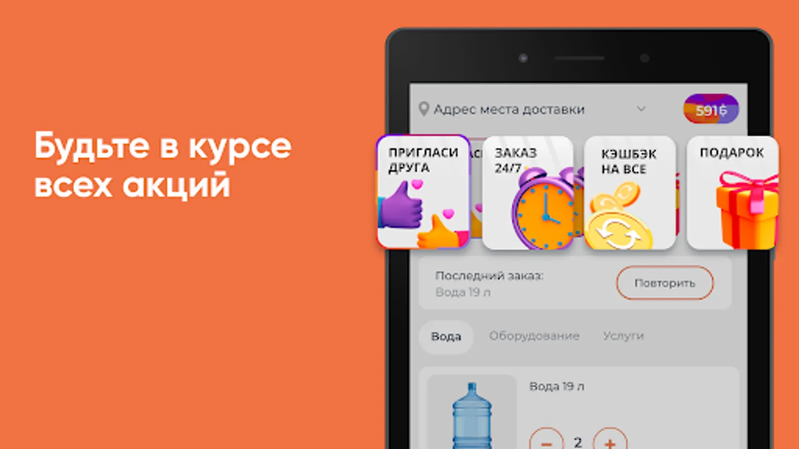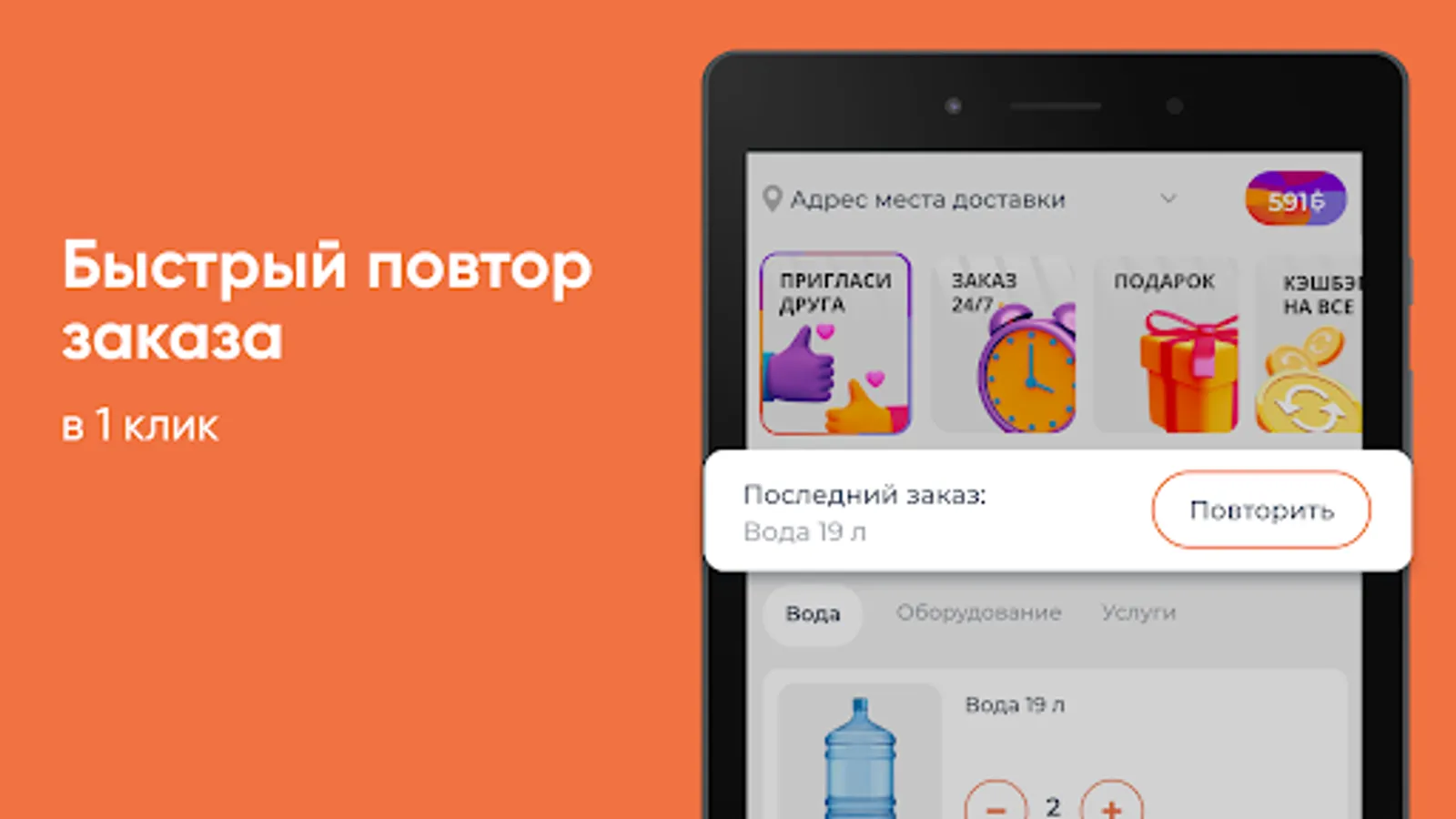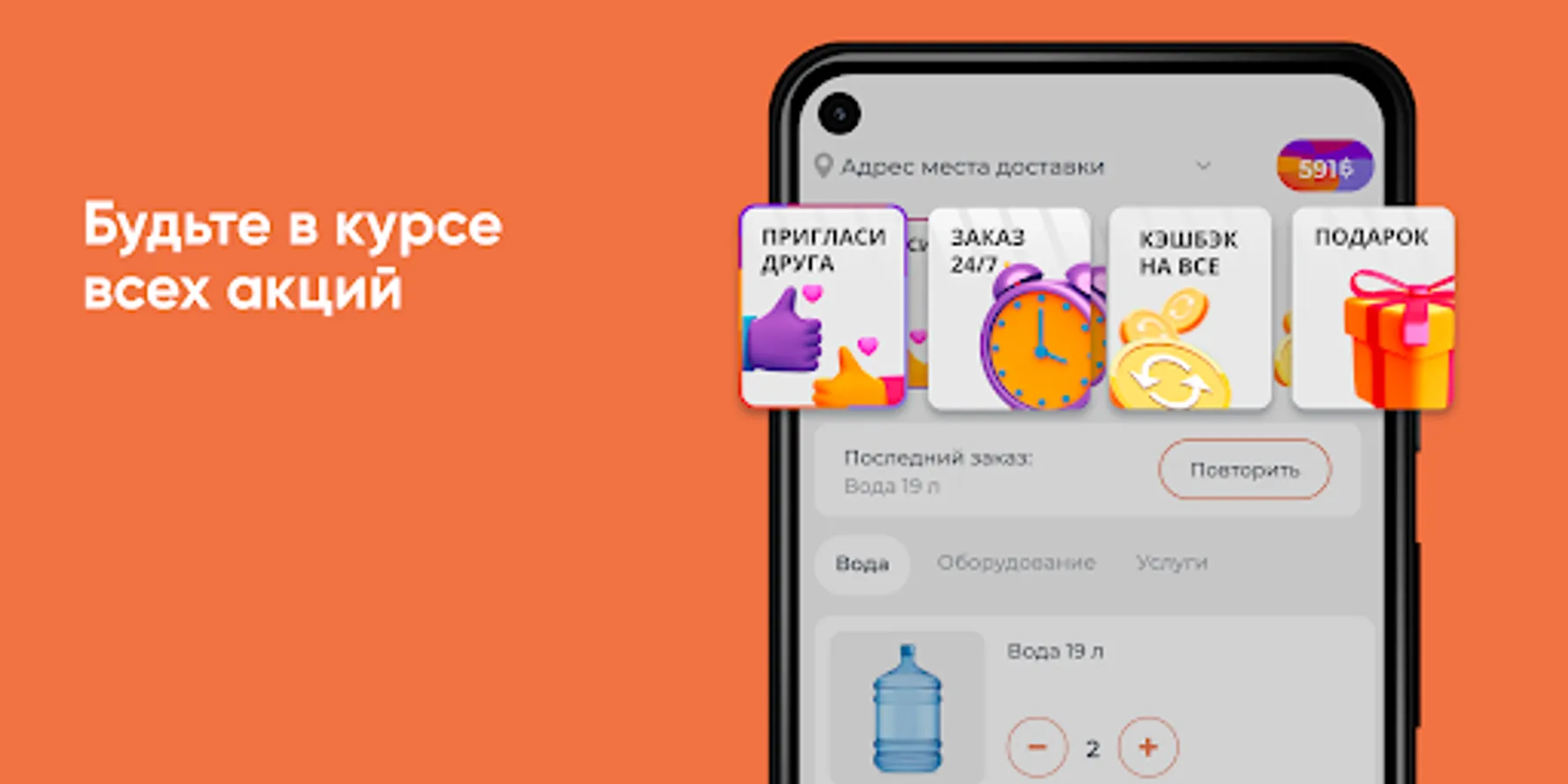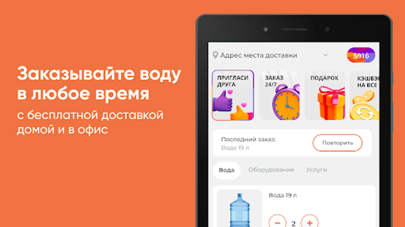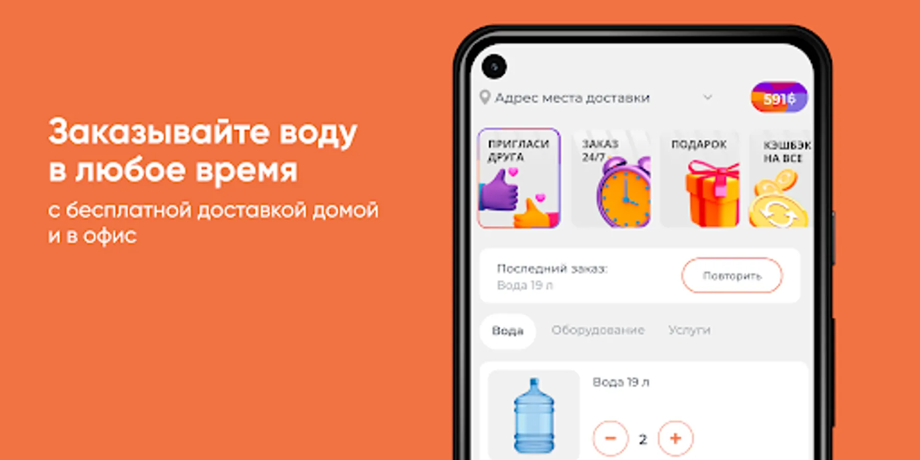 Download the Water for You app on your smartphone and order water 24/7. You will be able to repeat the order by pressing one button, see the entire history of purchases and be aware of all the company's promotions.