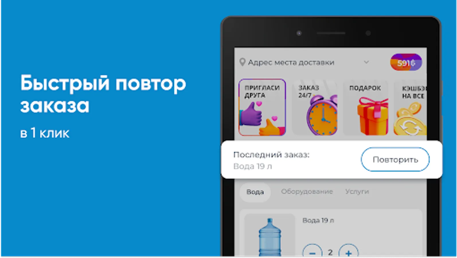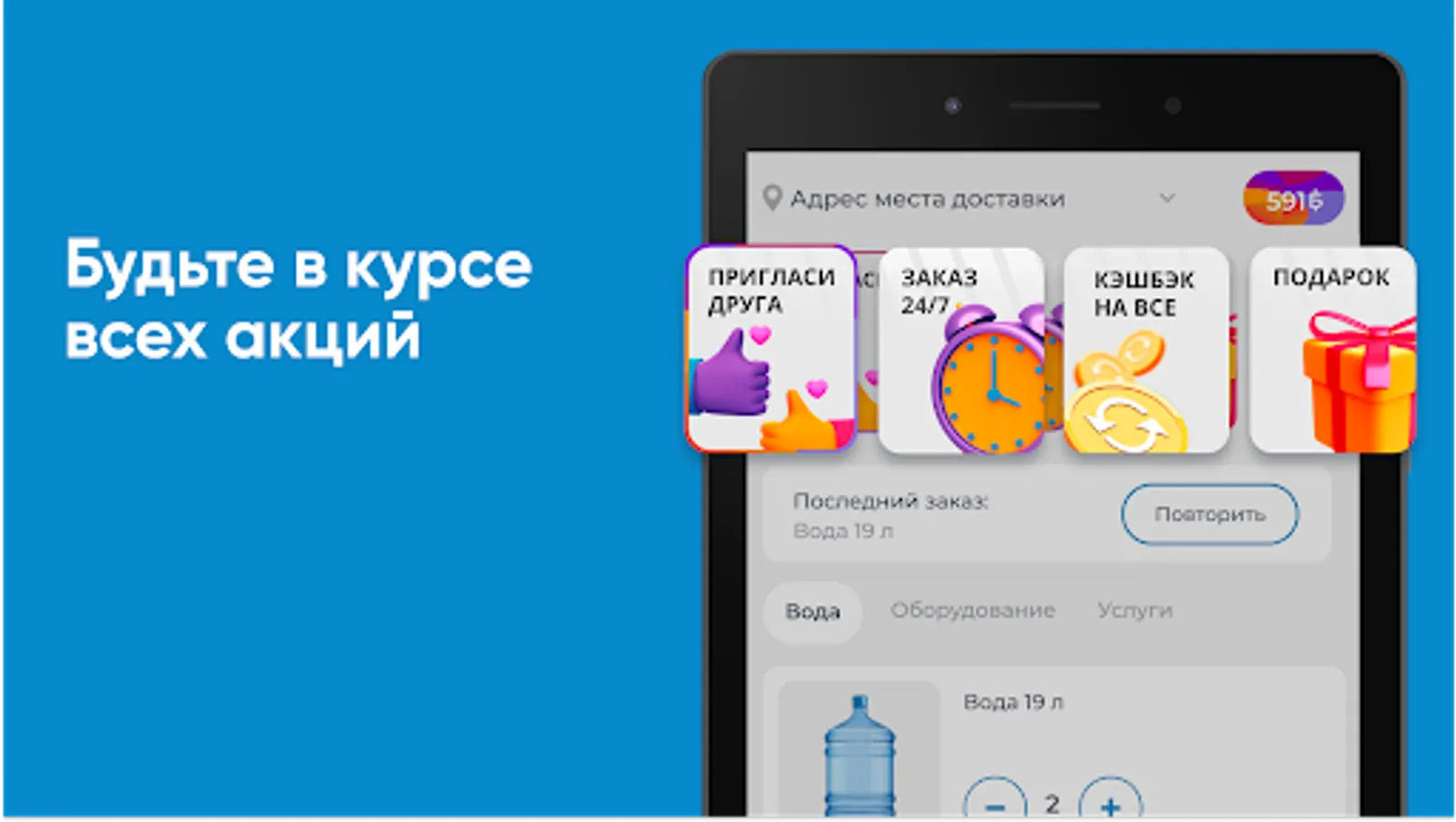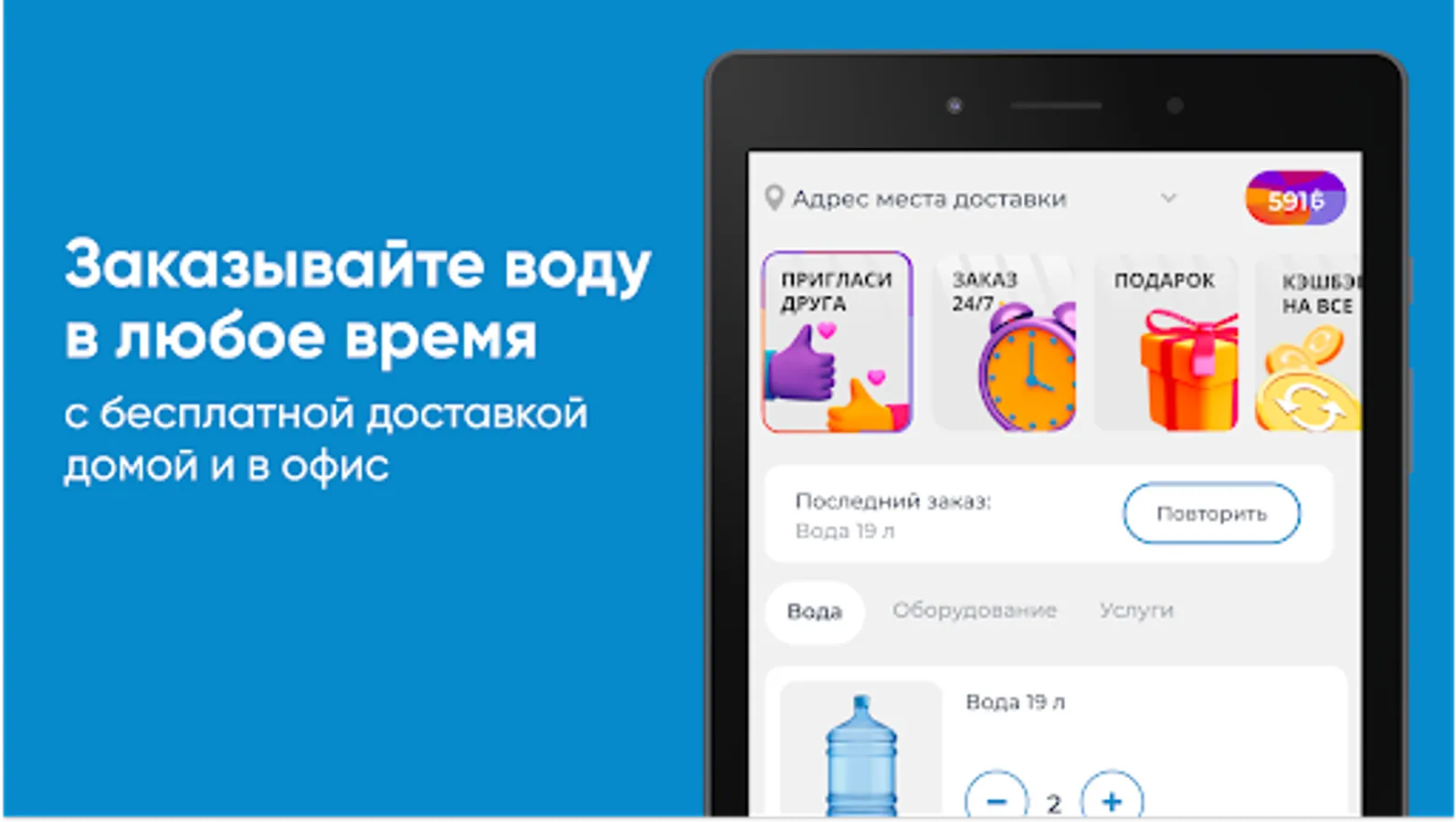 Download the Water of Life app on your smartphone and order water 24/7. You will be able to repeat the order by pressing one button, see the entire history of purchases and be aware of all the company's promotions.