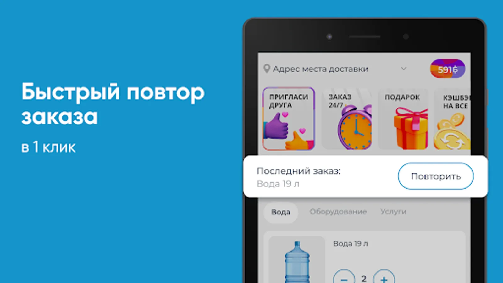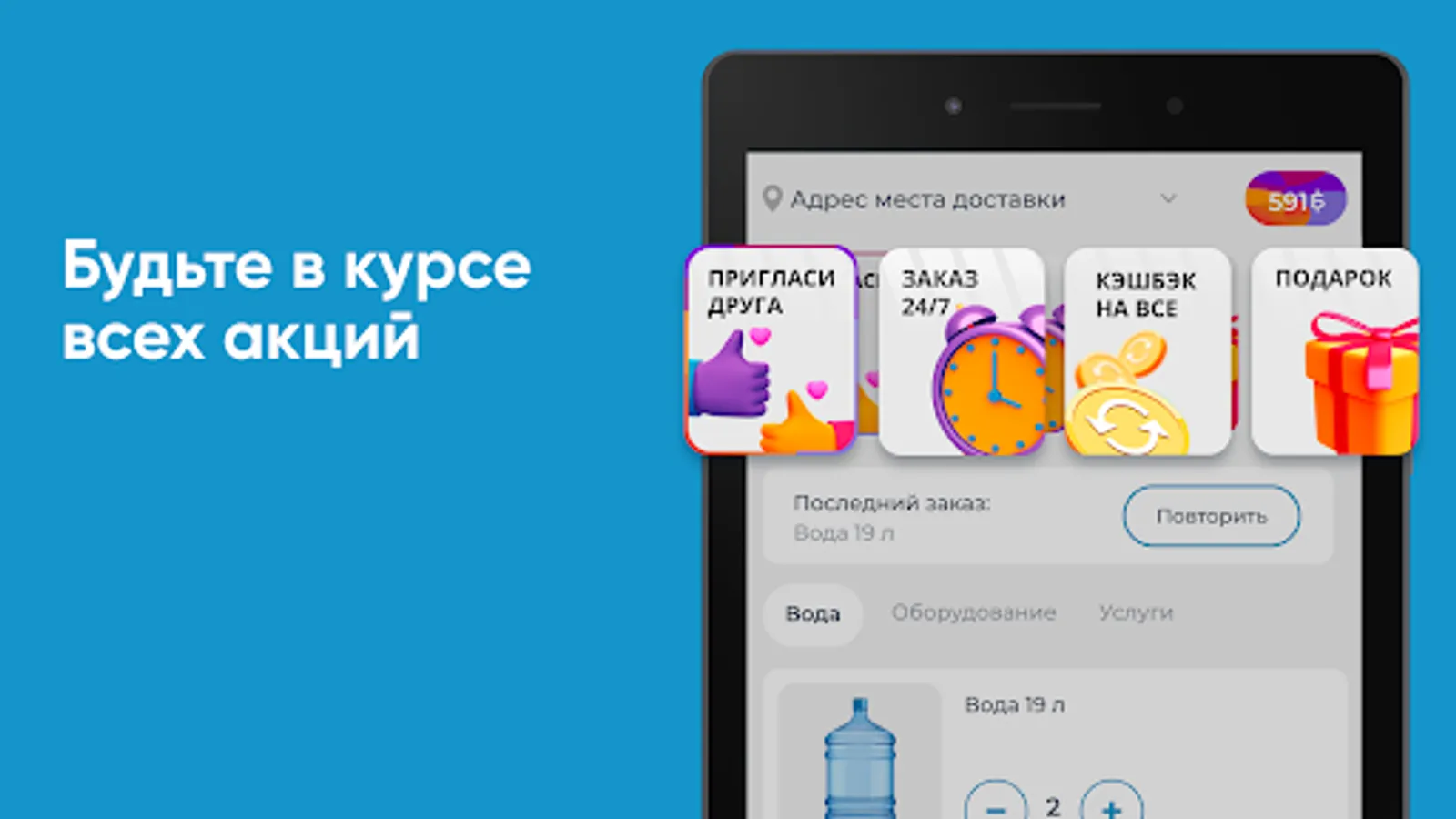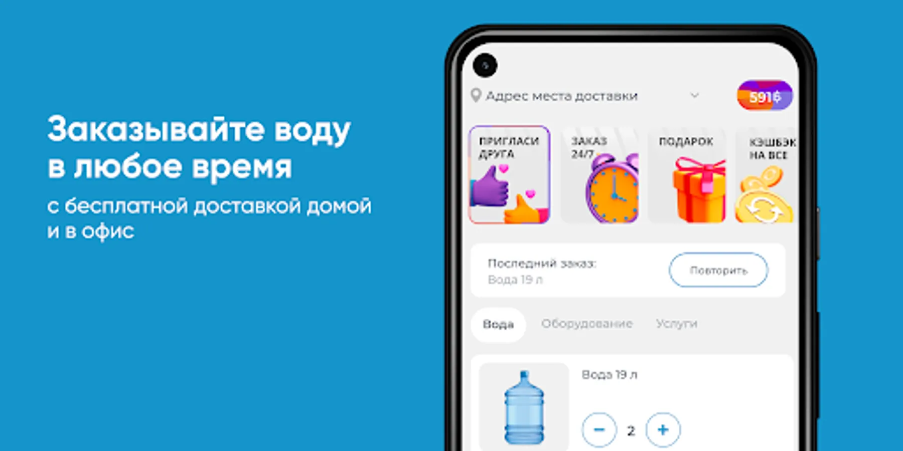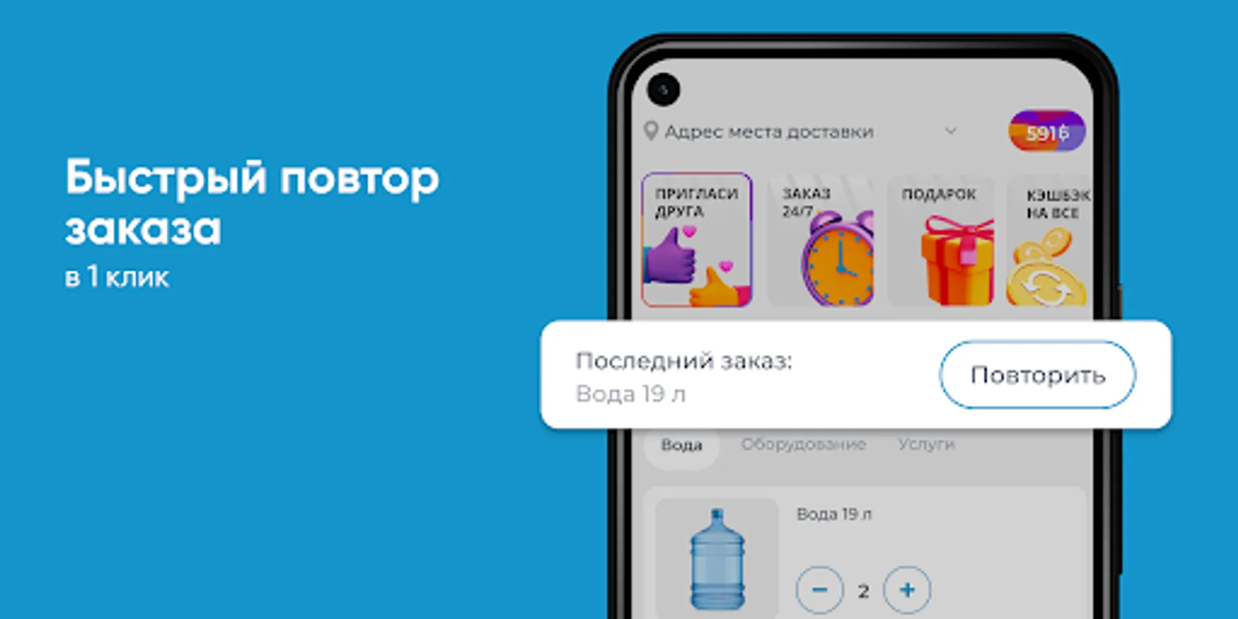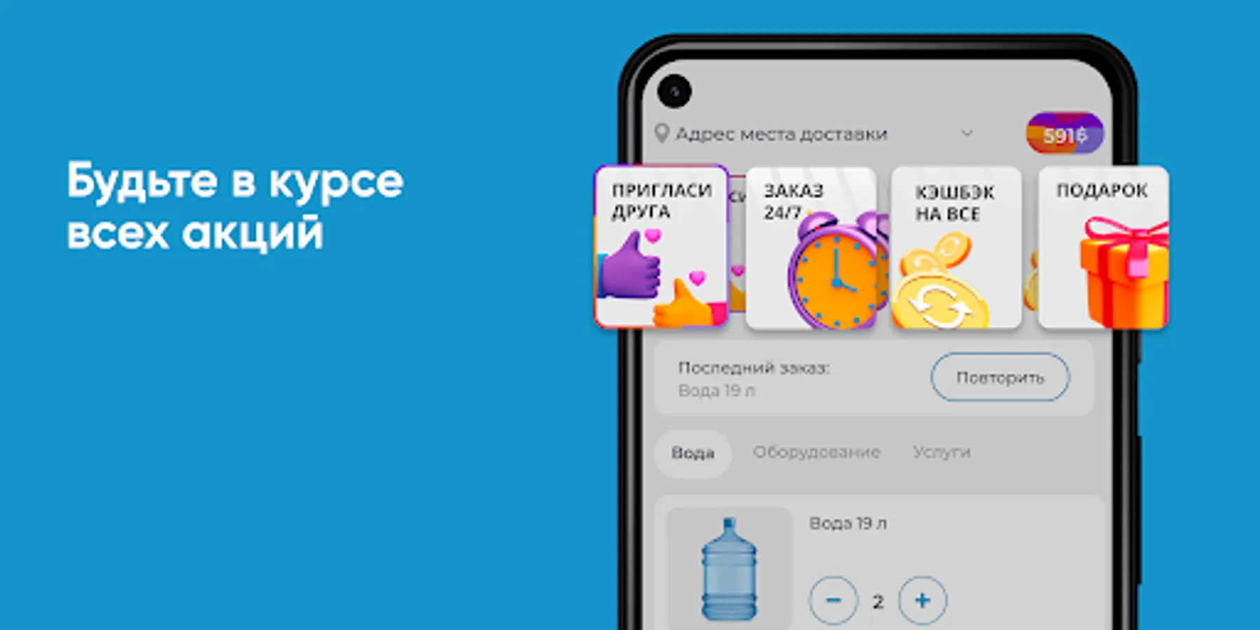 Download the Water World app to your smartphone and order water 24/7. You will be able to repeat the order by pressing one button, see the entire history of purchases and be aware of all the company's promotions.