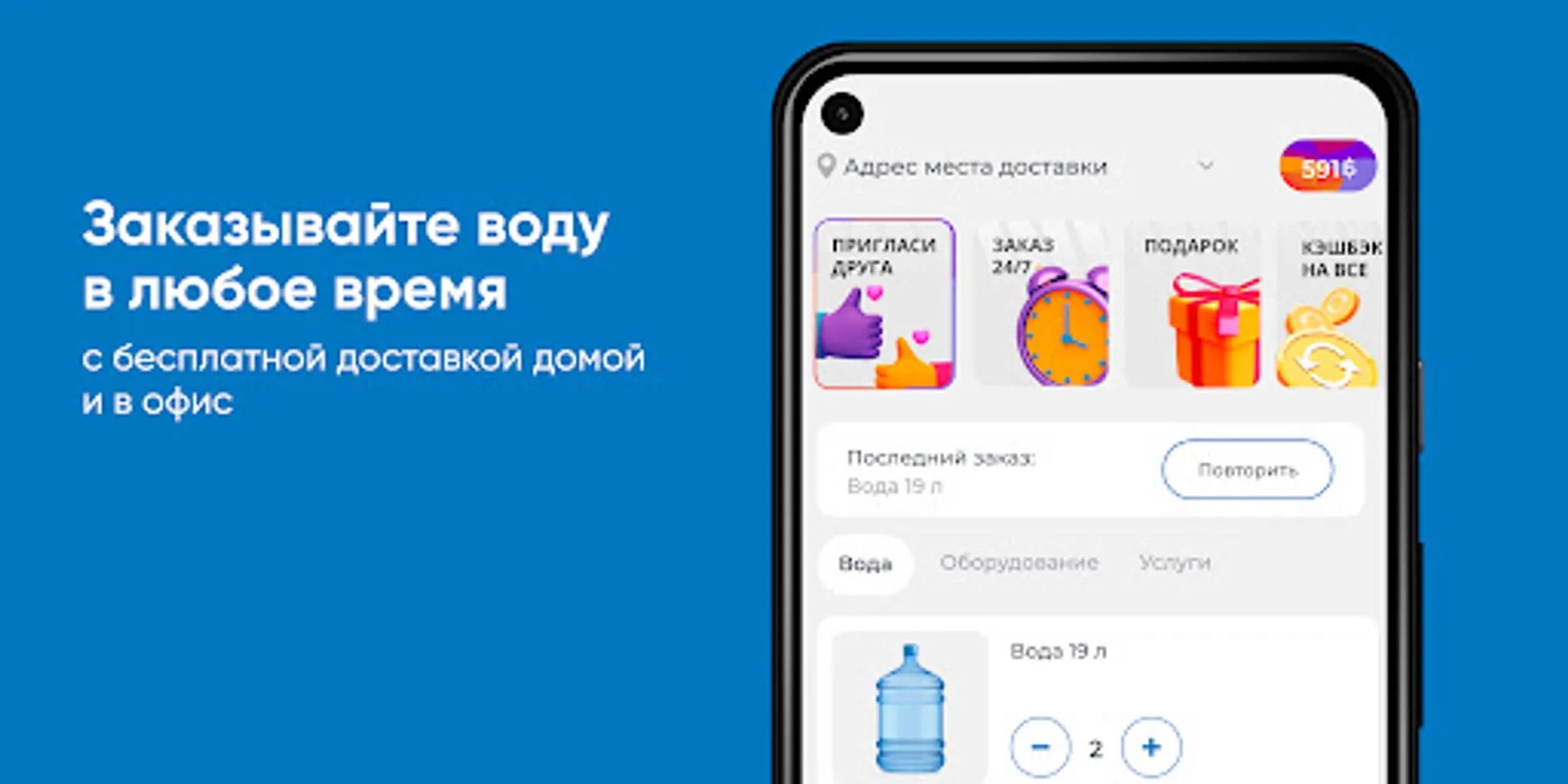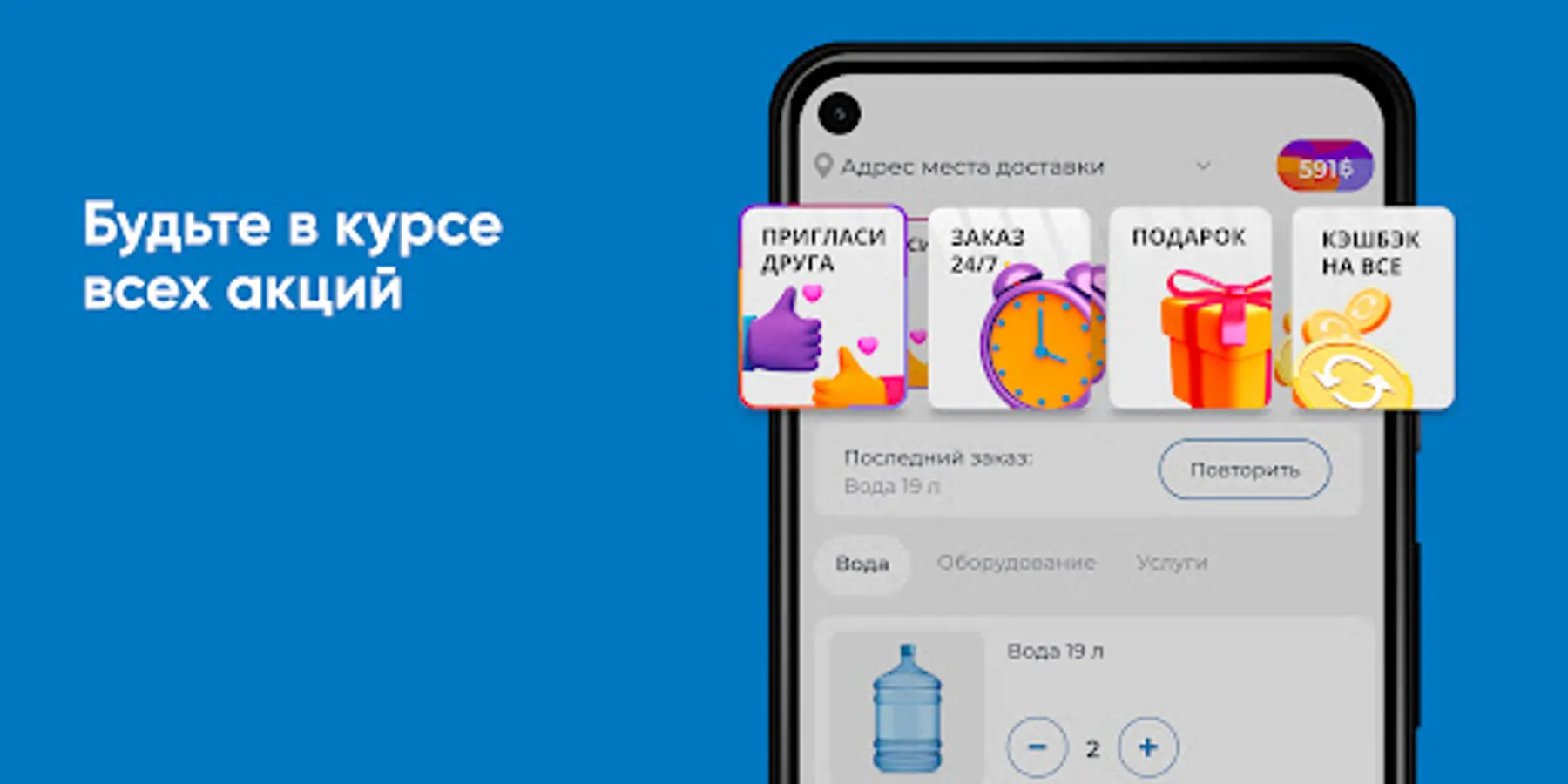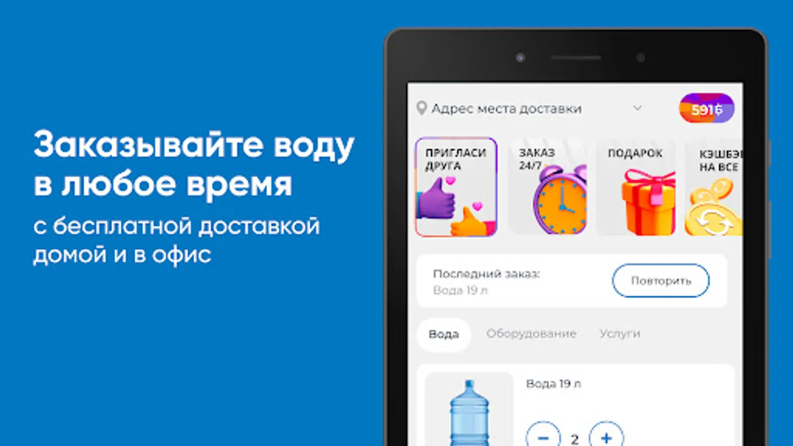Download the Khakassia Waterfall application on your smartphone and order water 24/7. You will be able to repeat the order with the click of a button, see the entire purchase history and keep abreast of all the company's promotions.