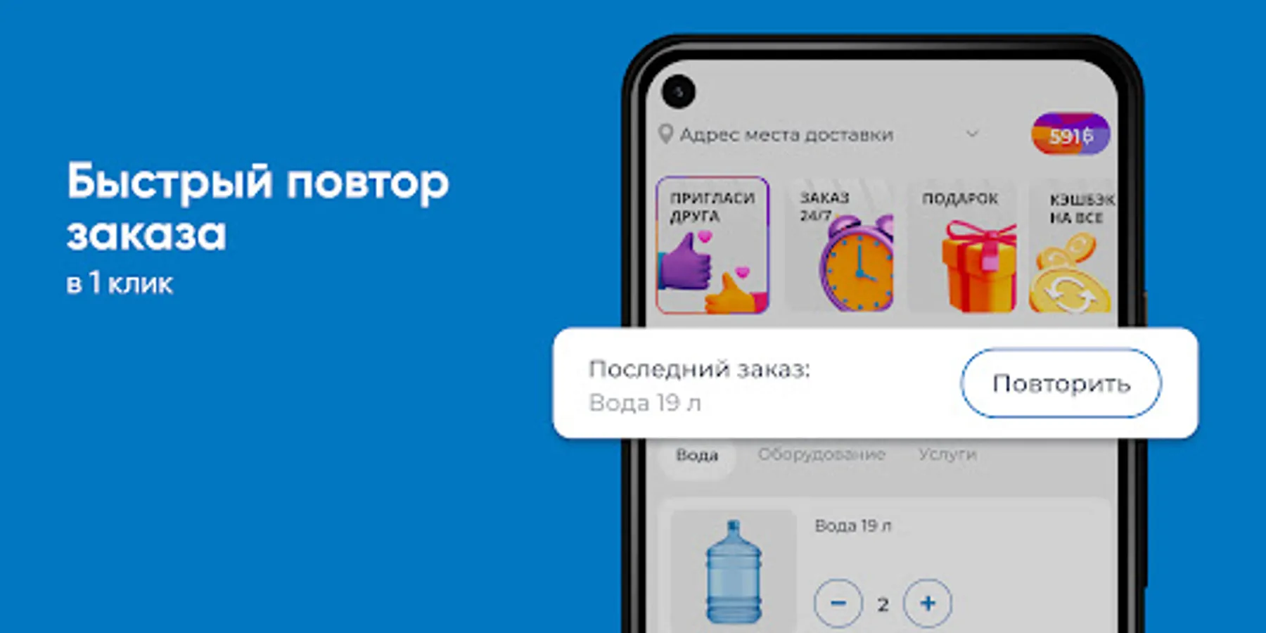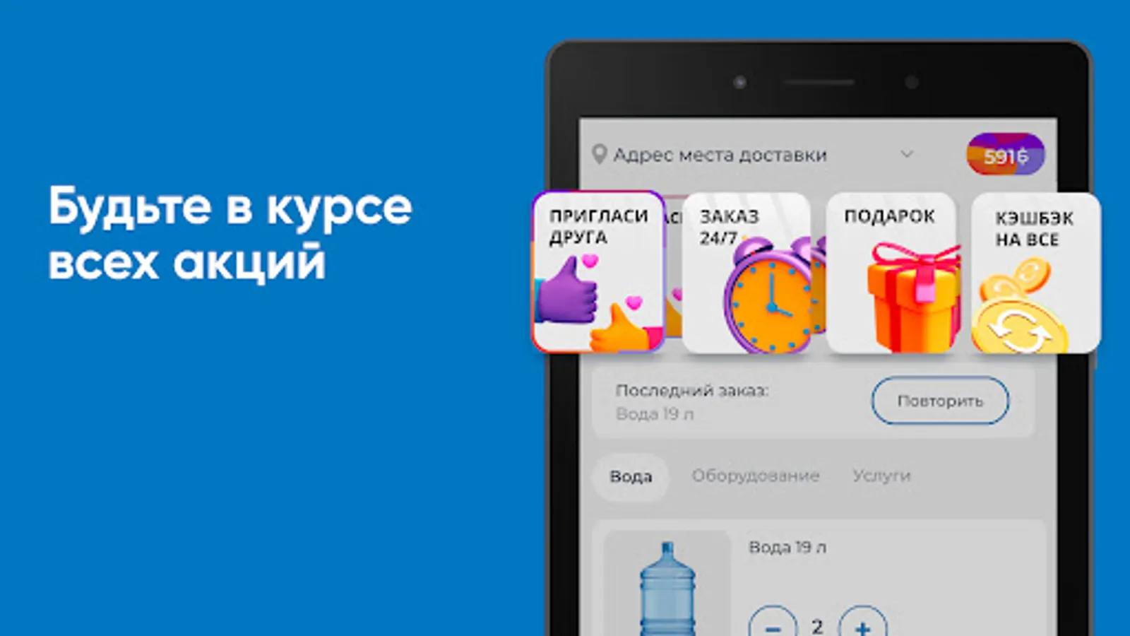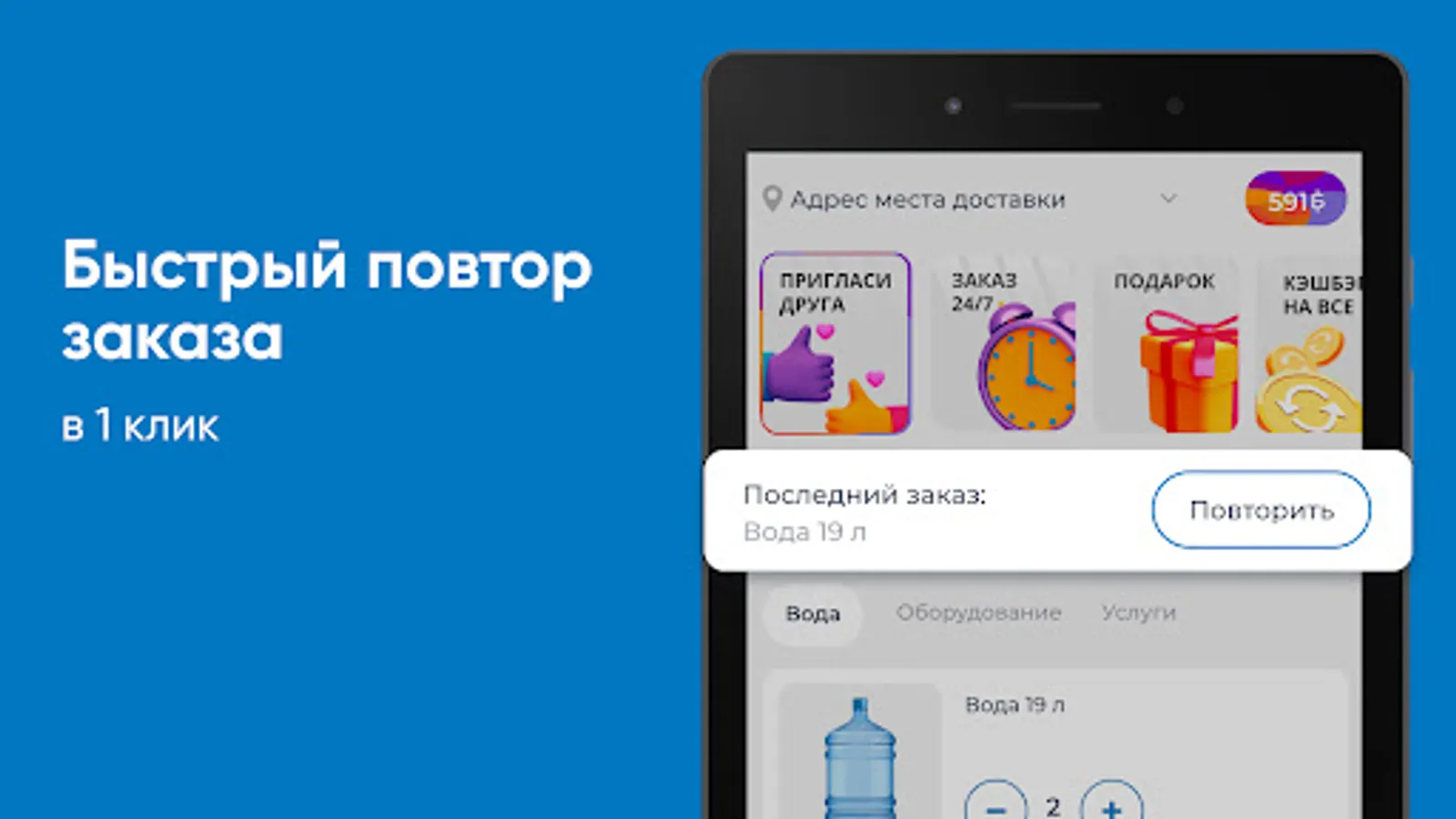Download the Khakassia Waterfall application on your smartphone and order water 24/7. You will be able to repeat the order with the click of a button, see the entire purchase history and keep abreast of all the company's promotions.