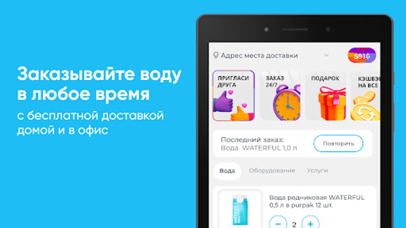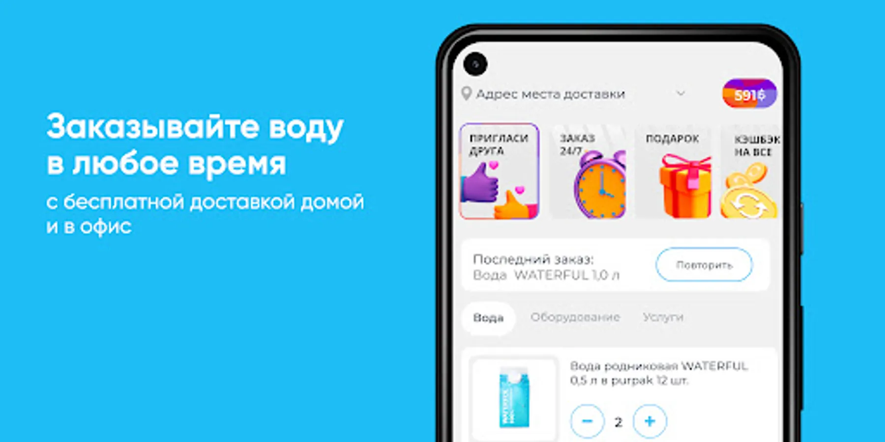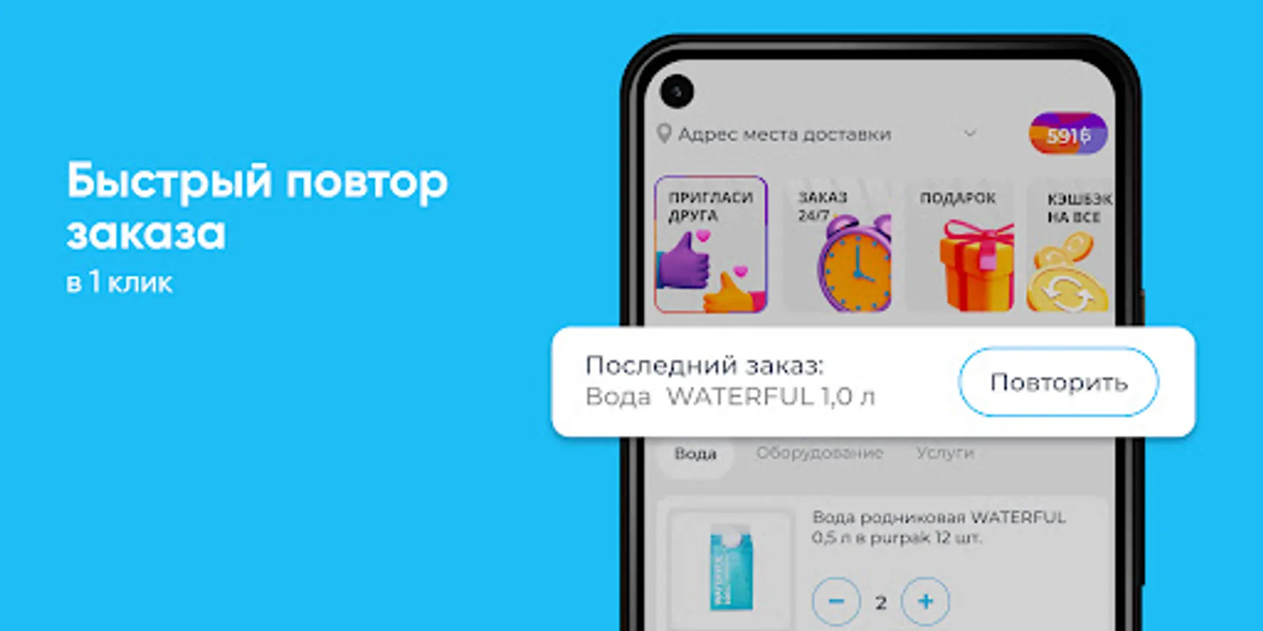 Download the WATERFUL app to your smartphone and order water 24/7. You will be able to repeat the order by pressing one button, see the entire history of purchases and be aware of all the company's promotions.
