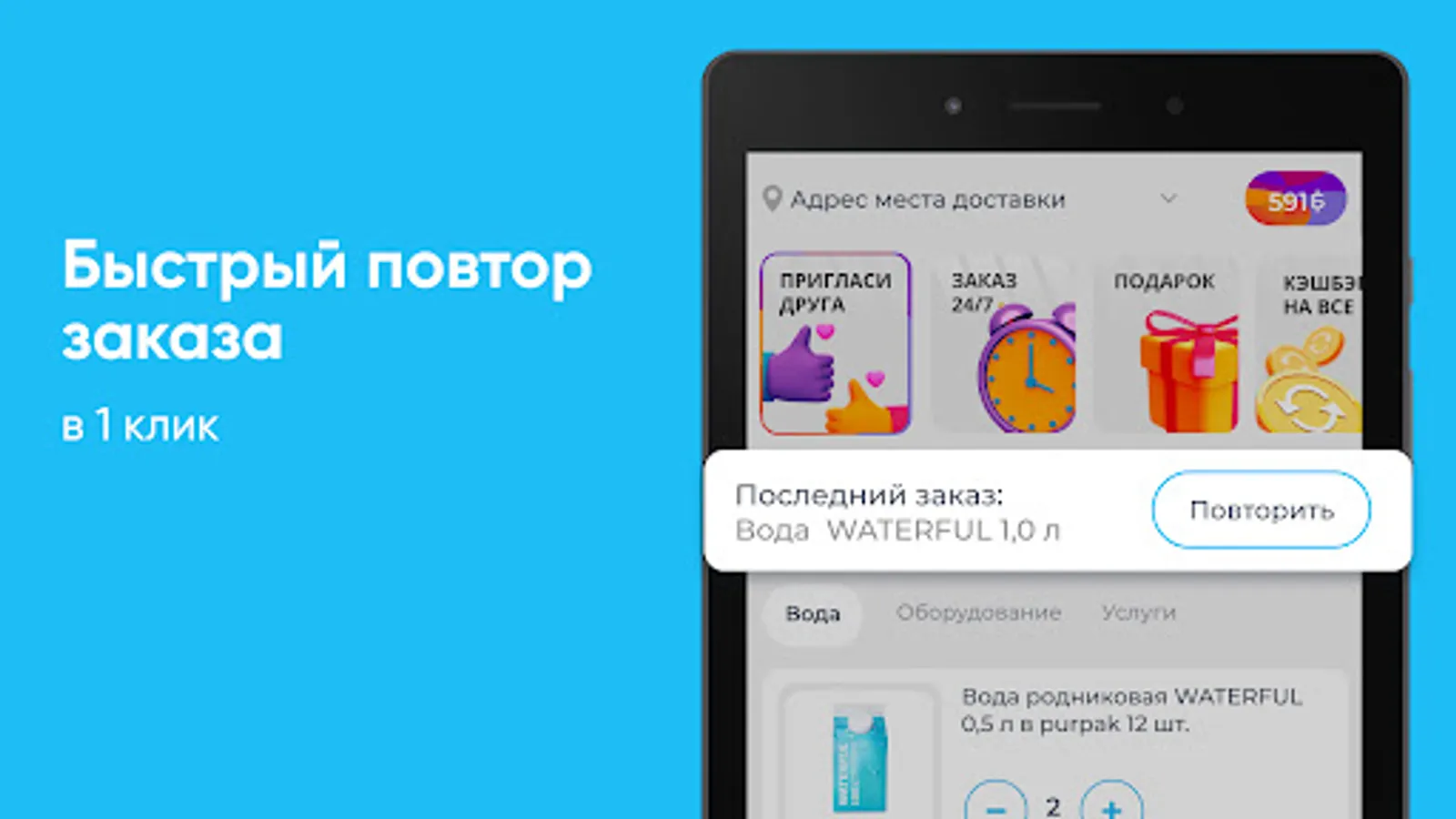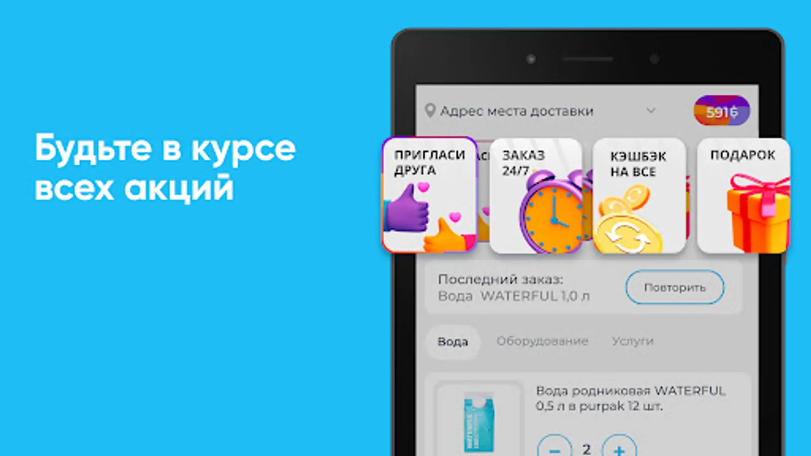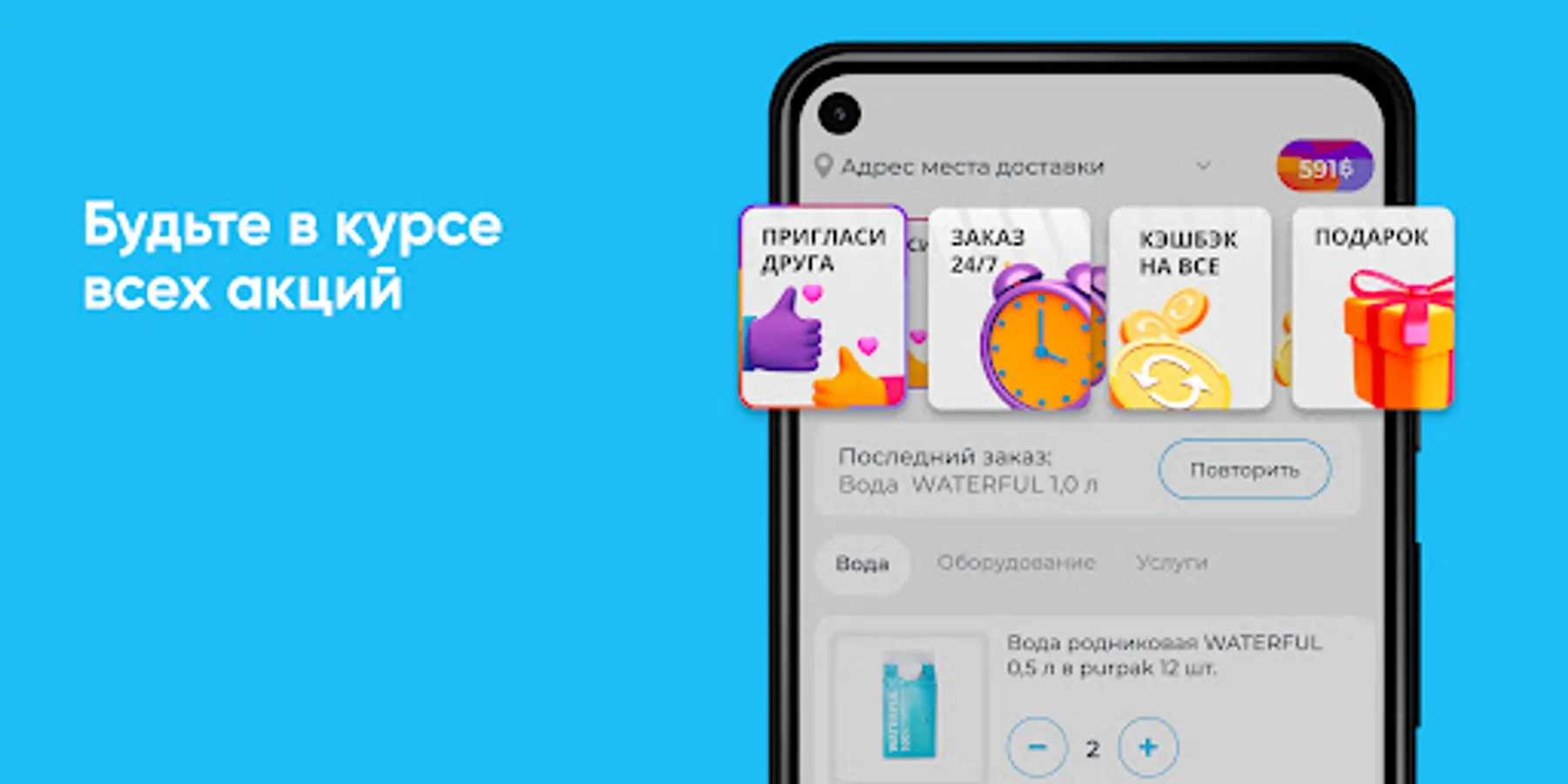 Download the WATERFUL app to your smartphone and order water 24/7. You will be able to repeat the order by pressing one button, see the entire history of purchases and be aware of all the company's promotions.