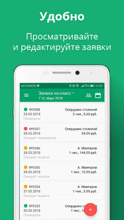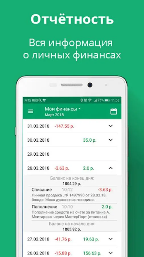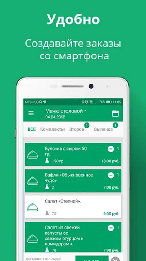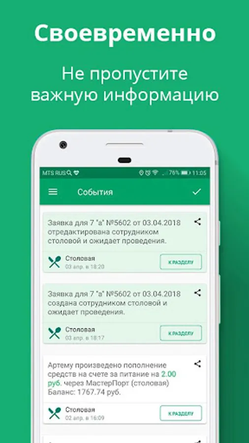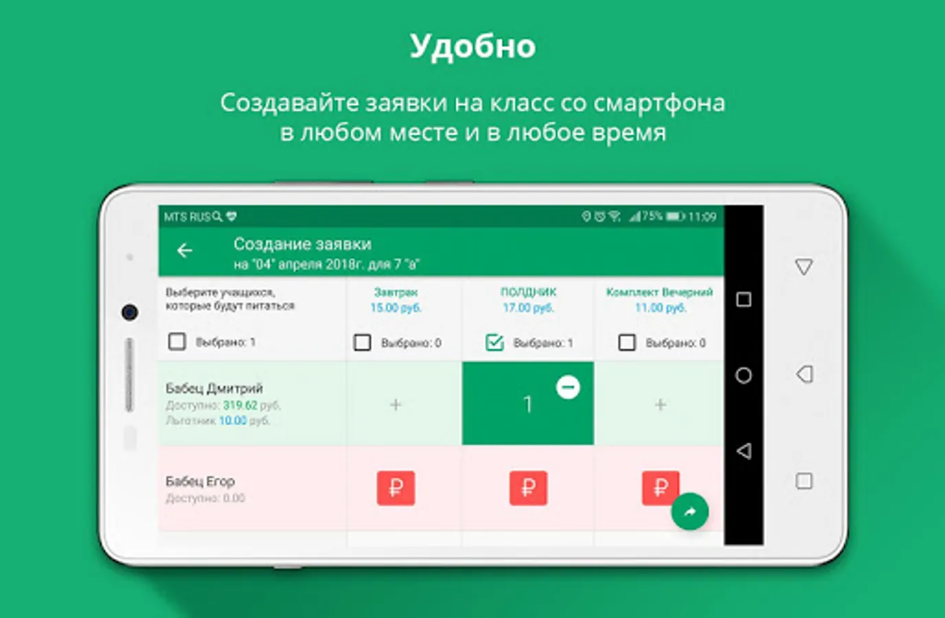 "Canteen" —employees of educational institutions can create applications for a class for collective meals (complex meals, meals for cover). Employees can create purchases using a mobile app, similar to self-service kiosks, and receive products at the point of delivery in the school cafeteria. They can also view information about the school cafeteria and school canteen: menu, order history, control the balance of funds on their account.