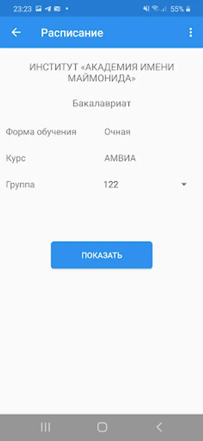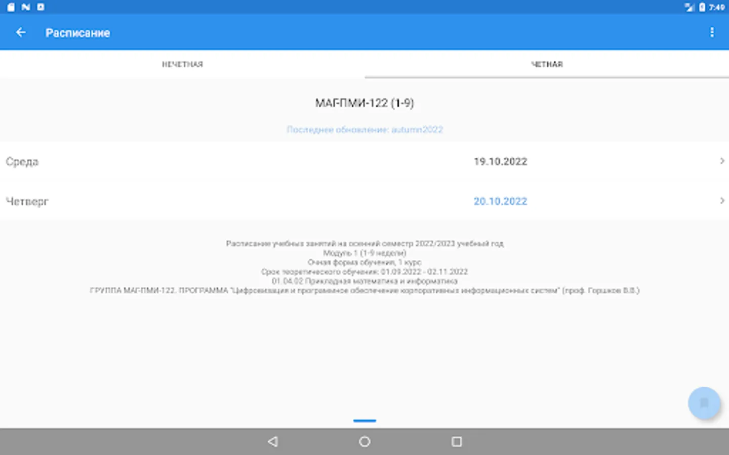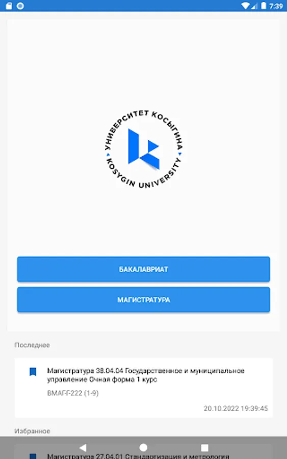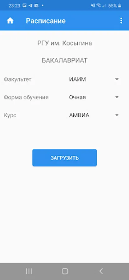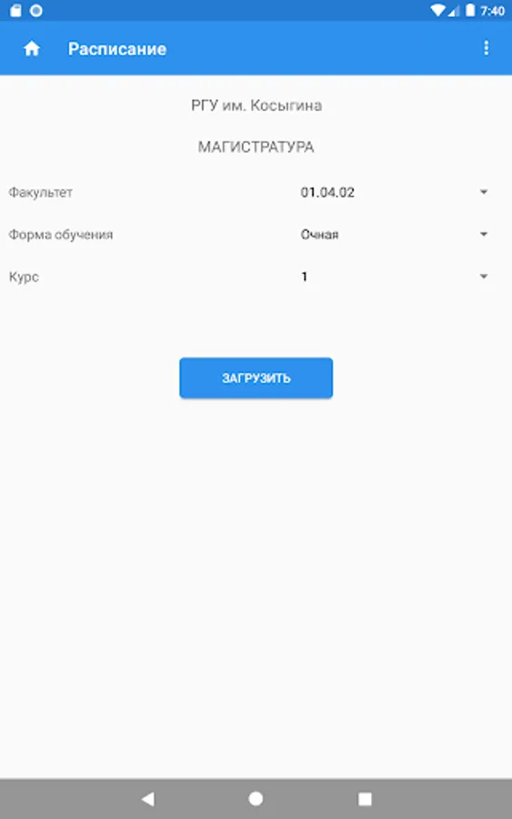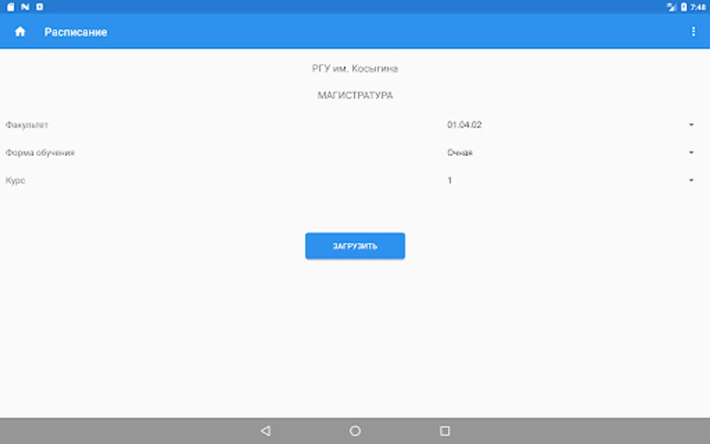 This application displays the schedule of training sessions of the Russian State University. Kosygin full-time and part-time forms of education.