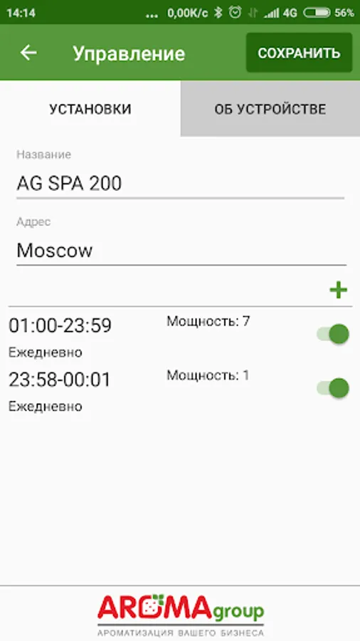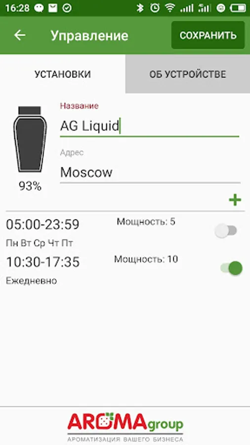 AromaCONTROL - This is a free Android application of remote monitoring and control of equipment operation for domestic and commercial premises and deodorization flavor production company AROMAgroup®. Simple and intuitive interface AromaCONTROL allows you to quickly connect to a Bluetooth equipment and make the necessary settings. Use AromaCONTROL application for remote configuration mode devices by setting daily and weekly settings on / off, as well as the level of intensity of flavor. Want to know how much aromatherapy oil left in the cartridge? And this can be done using AromaCONTROL application without opening the unit itself!