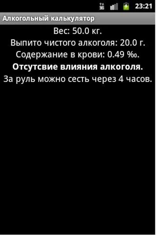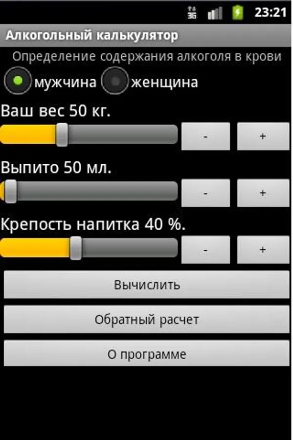 A program for calculating blood alcohol content and assessment of your condition depending on the amount of alcohol consumed, its fortress and the time elapsed after its use.