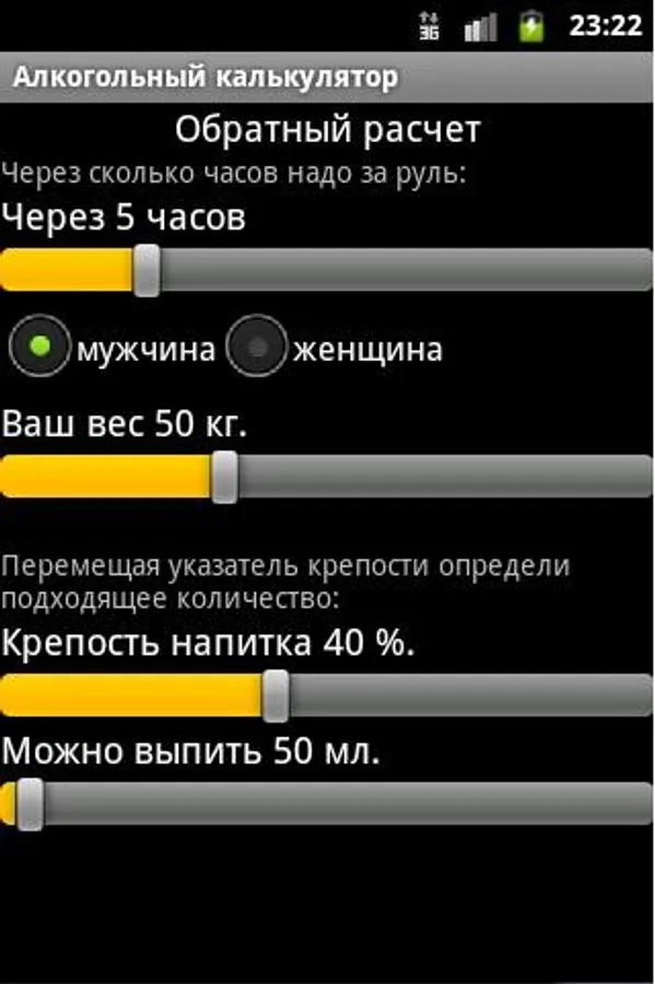 Added possibility "reverse calculation", calculates recommended to use the amount of alcohol, depending on the beverage strength and the time required for complete removal of alcohol from the blood, i.e. knowing how many hours you must get behind the wheel and an assortment of drinks, you can calculate the maximum dose.