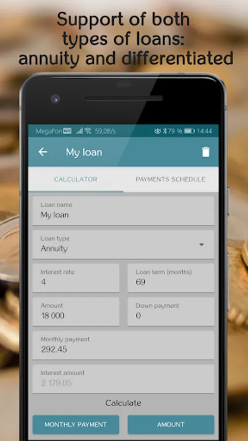 - Ability to calculate any of main parameters of the loan (monthly payment, amount, interest rate or term)