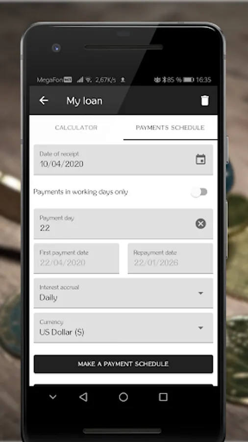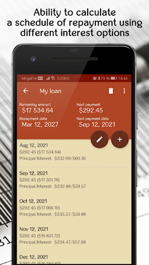 Loan Calculator helps you to calculate monthly payment, interest rate, term, interest or loan amount. It allows to create payment schedule and to plan repayment of the loan. Also using this app you can track you loans and never forget about payments.