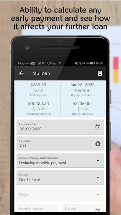 - Ability to calculate any early payment and see how it affects your further loan