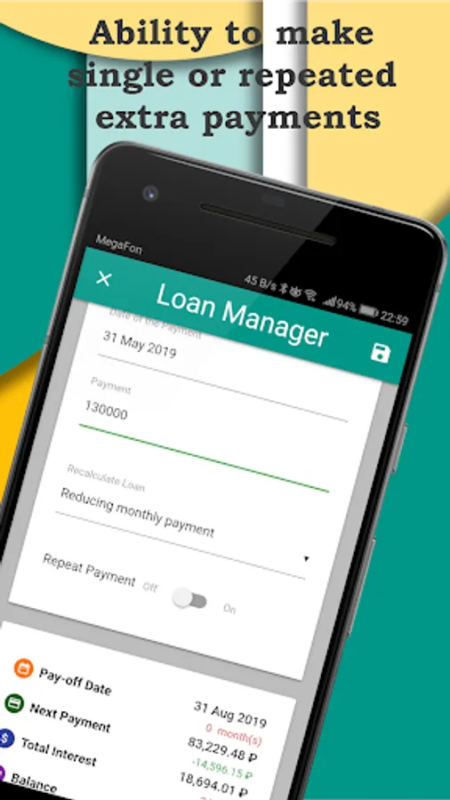 - Setting to calculate loan repayment (reducing loan term or monthly payment)