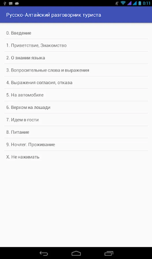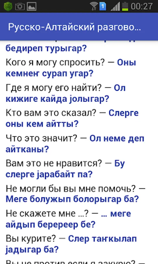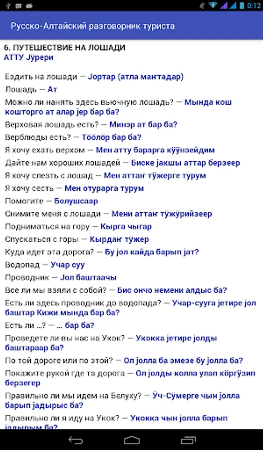 "Russian-Altai phrasebook for tourists" is intended for Russian-speaking tourists, travelers traveling to Altai for both leisure and business purposes. The application can also be used by employees of travel agencies and agencies, services and hospitality. The language material covers the words and phrases that are most often used and meet the most basic needs of travelers.