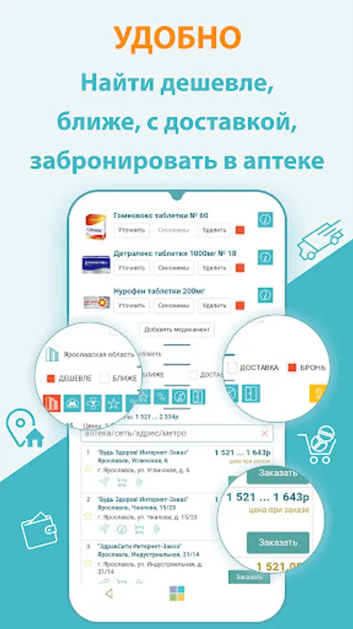 The Yaroslavl Pharmacy application will help you find and buy medicines in pharmacies closer, cheaper. Delivery of medicines. Prices for medicines are presented on a map or list.