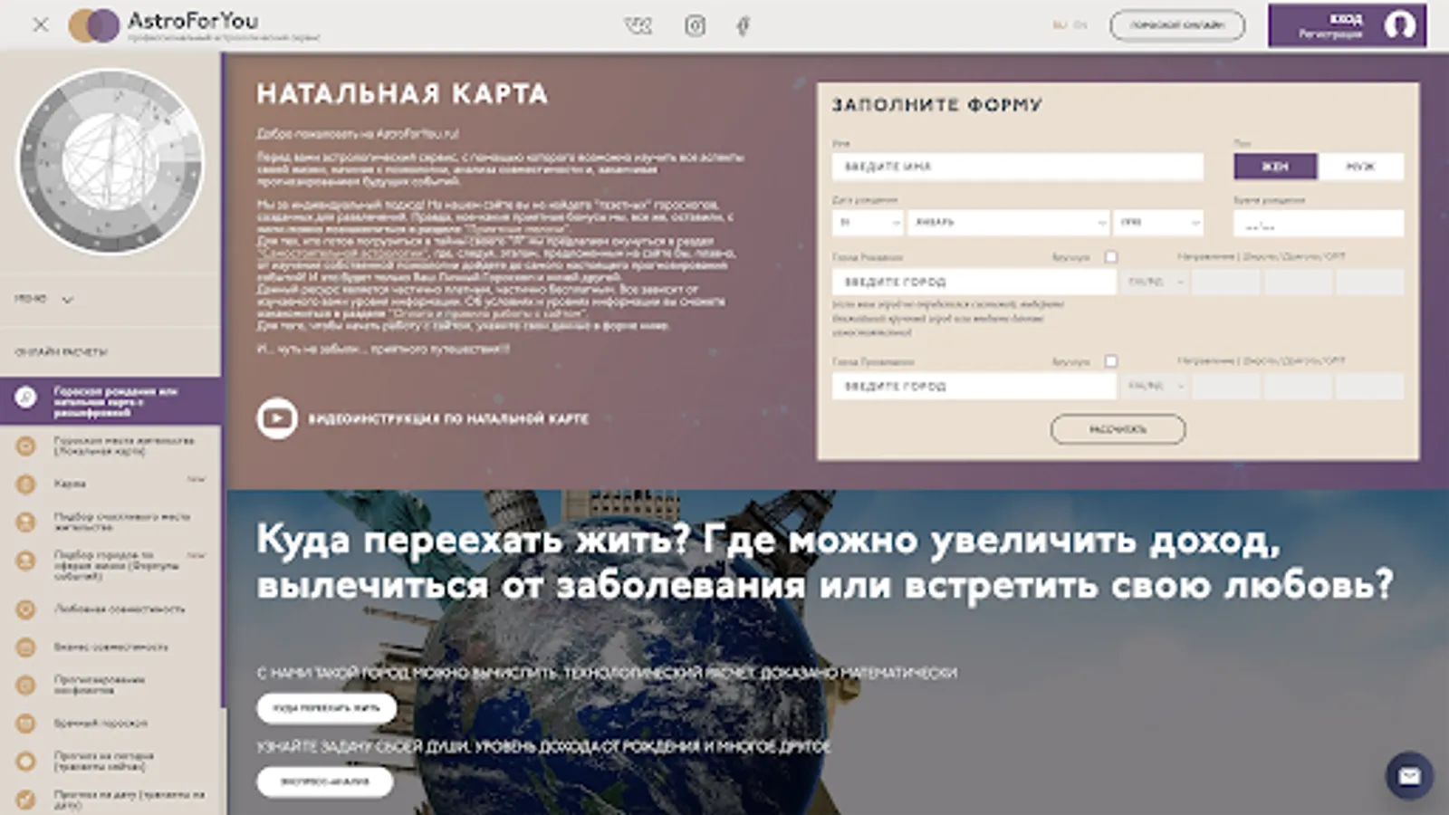 Where to move to live? Where can you increase your income, recover from a disease or meet your love? With us, you can determine the best city to live in, track the forecast, make compatibility, find out karmic developments or consult with a certified astrologer. Professional astrological calculations for every area of life.