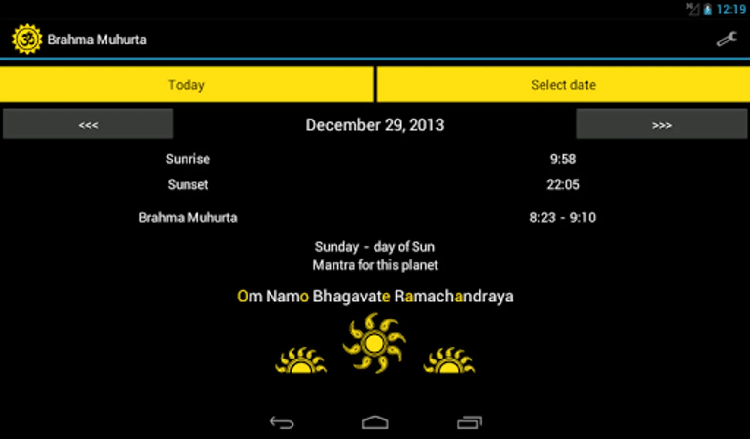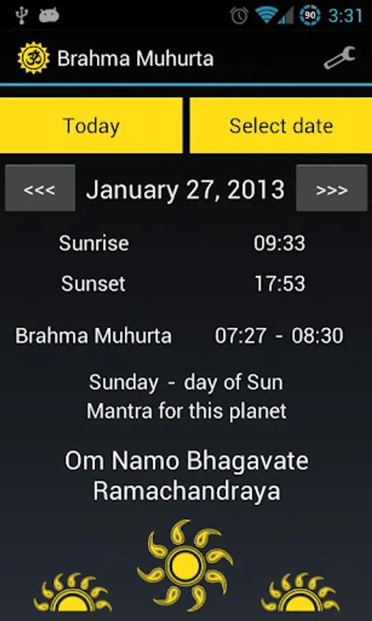 - Calculating time of sunrise, sunset and Brahma Muhurta for any given location and date.