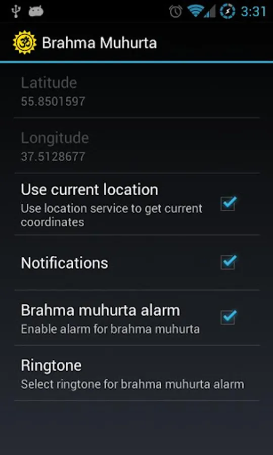 The program is designed to set alarm for the beginning of Brahma Muhurta. Brahma Muhurta is special time period before dawn when energy of goodness prevails so it is the best time to wake up and meditate. Alarm is adjusted automatically each day.