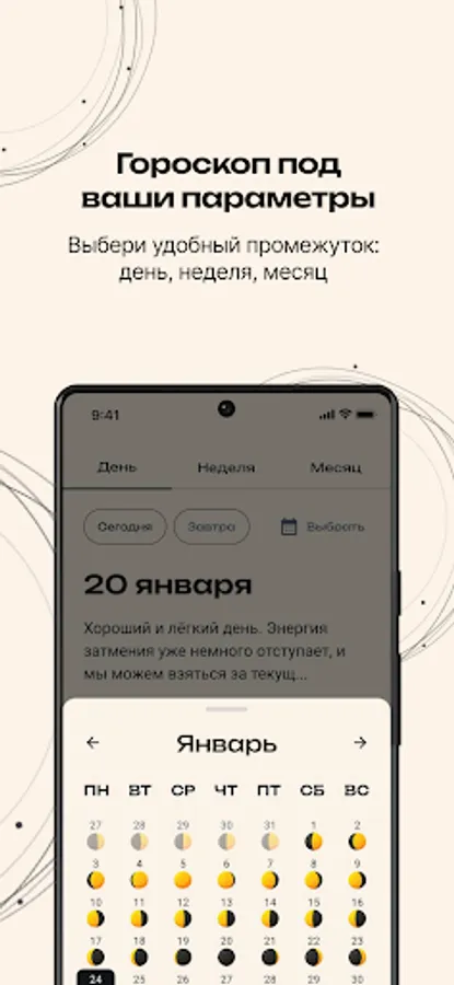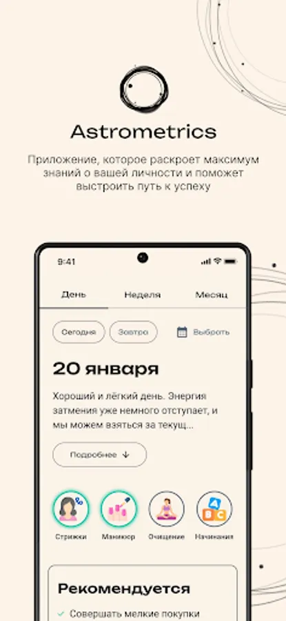 AstroMetrics — это больше, чем ежедневные гороскопы. Это персональное руководство к лучшему пониманию себя и окружающих. Начните планировать своё будущее с прогноза на день, постепенно заглядывая в прогнозы на завтра, неделю, месяц и даже год!
