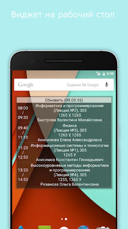 - a widget on the desktop and a lock screen that displays the current schedule for the current day (available for users with Android version from 4.1, with automatic download enabled)