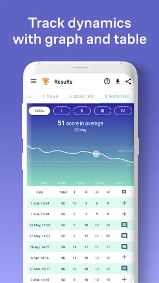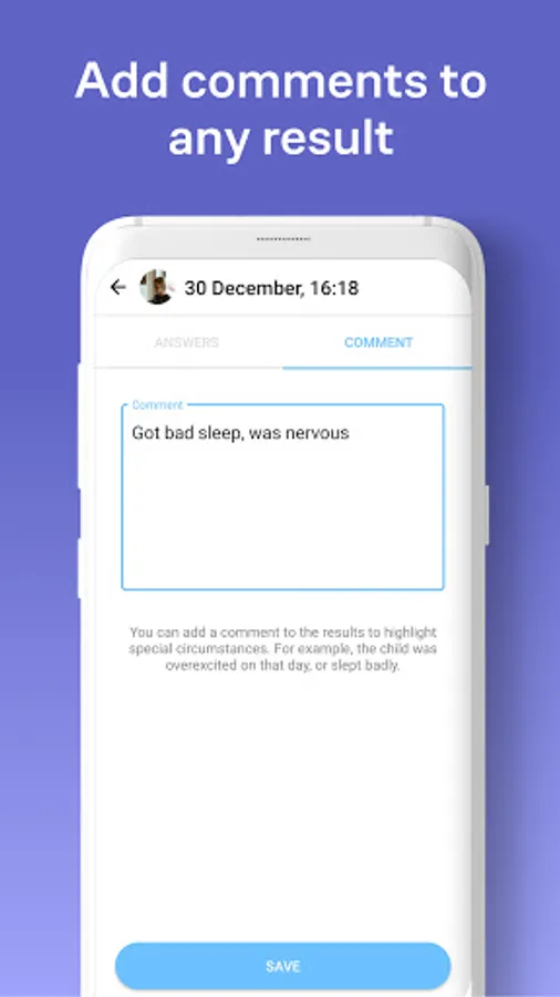 For more correct scores, it is better if different people in contact with the child take the test. For example, if on the same day dad, mom, and specialist in the rehabilitation center give different answers, you will get a different number of points. The application will calculate the average score on that day and show it on the chart.