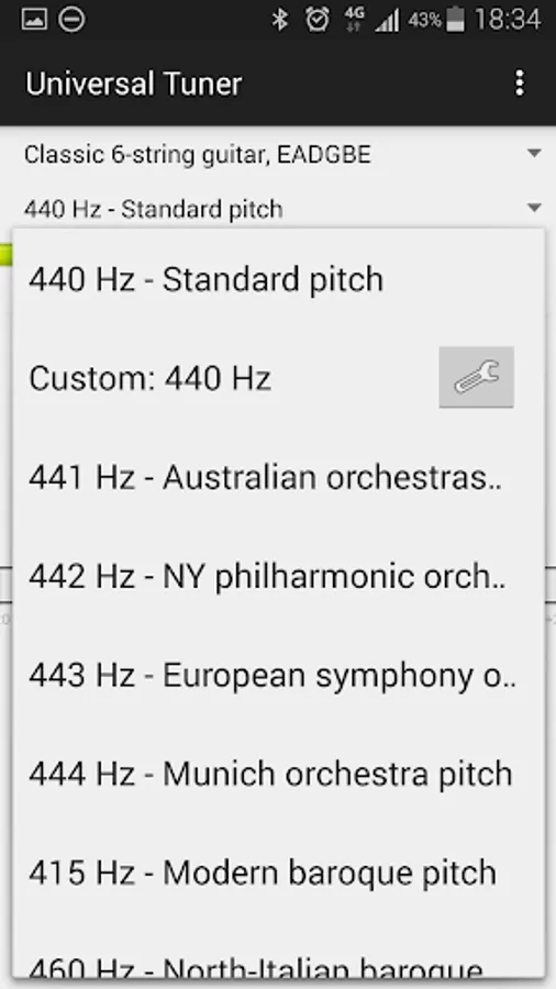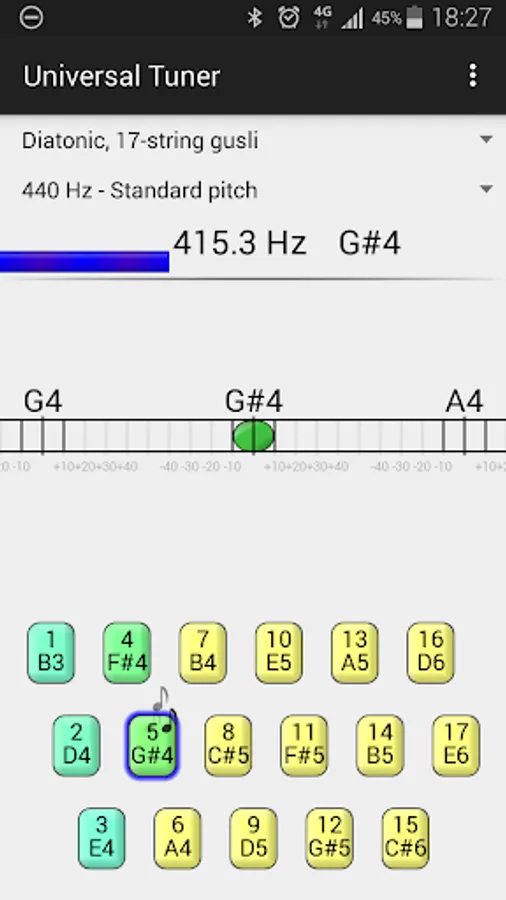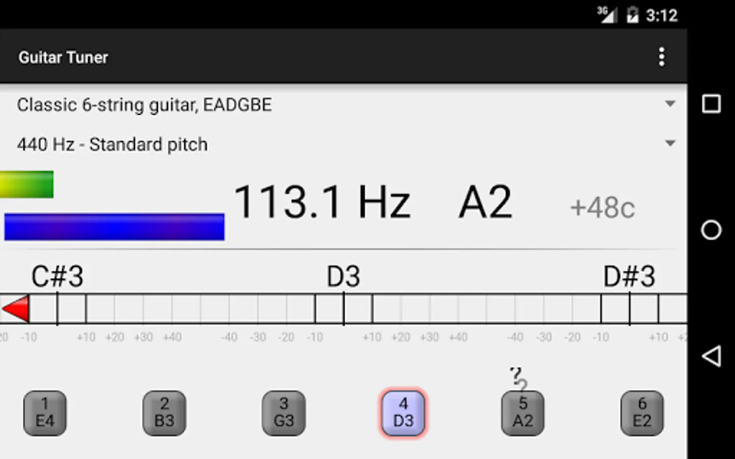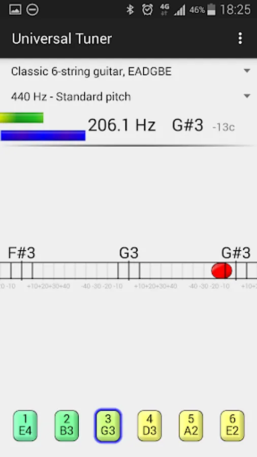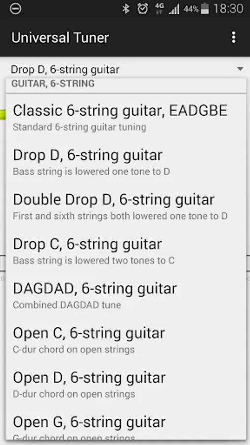 - Auto (default) - The tuner will try to determine which string is tuned at the moment, changing the color of already tuned strings.