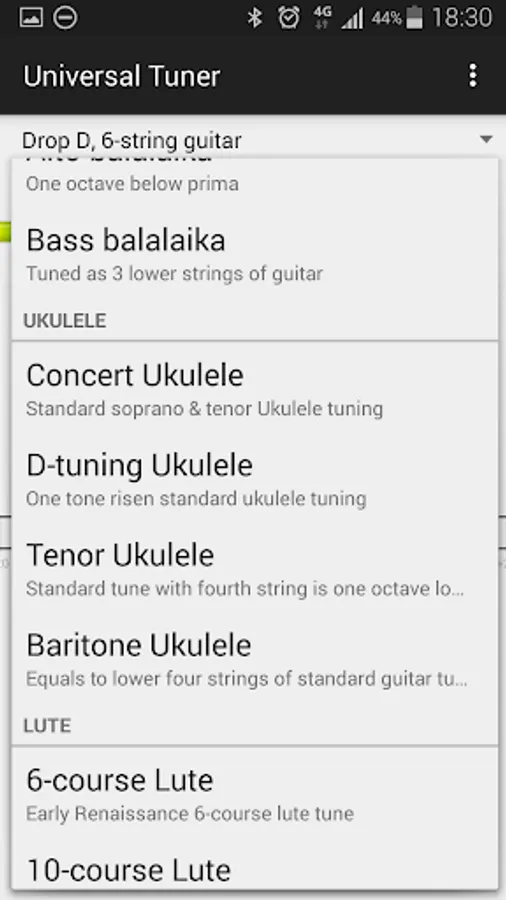This tuner allows to tune a variety of musical instruments: six- and seven-string guitar, bass guitar, gusli, balalaika, domra, lute, ukulele, koto, shamisen, violin, viola, cello, double-bass, kalimba, oud, banjo, guzheng, gayageum.