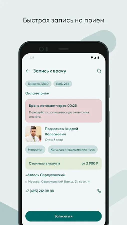 Choose a convenient day and time for a visit to a doctor or an online consultation and sign up directly in the application without wasting time on calls and correspondence. Atlas clinics receive doctors in the main areas of medicine, including professors, doctors and candidates of medical sciences.