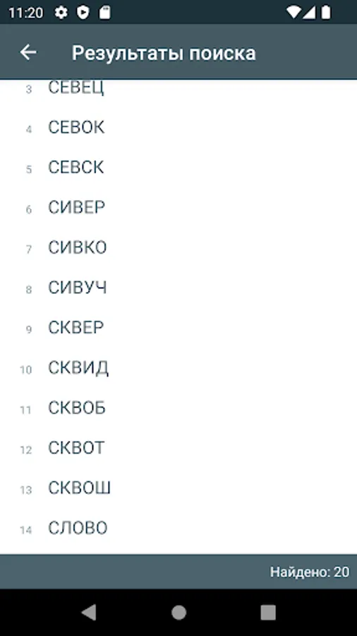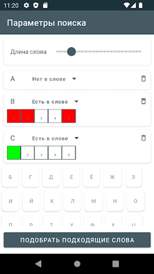 For the search, you can specify the length of the word, the presence or absence of letters, as well as the presence or absence of letters in the position of the word.