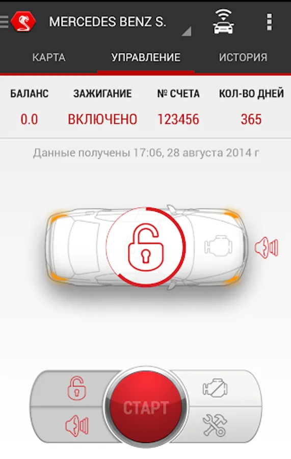 • Obtaining information about the car (battery charge, the state of the ignition mode "Service", "Protection", etc.).
