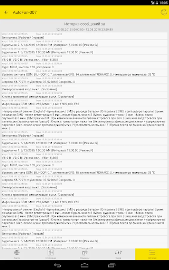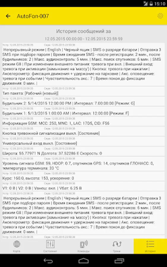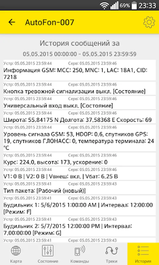 - View all or only important messages from devices for arbitrary intervals grouped by the time they were received and the ability to display on the map the place of receipt of a specific message and step-by-step navigation on them.