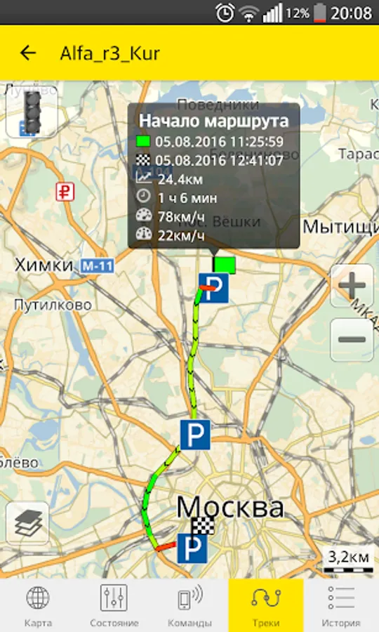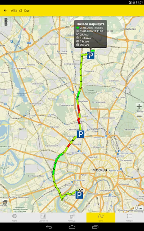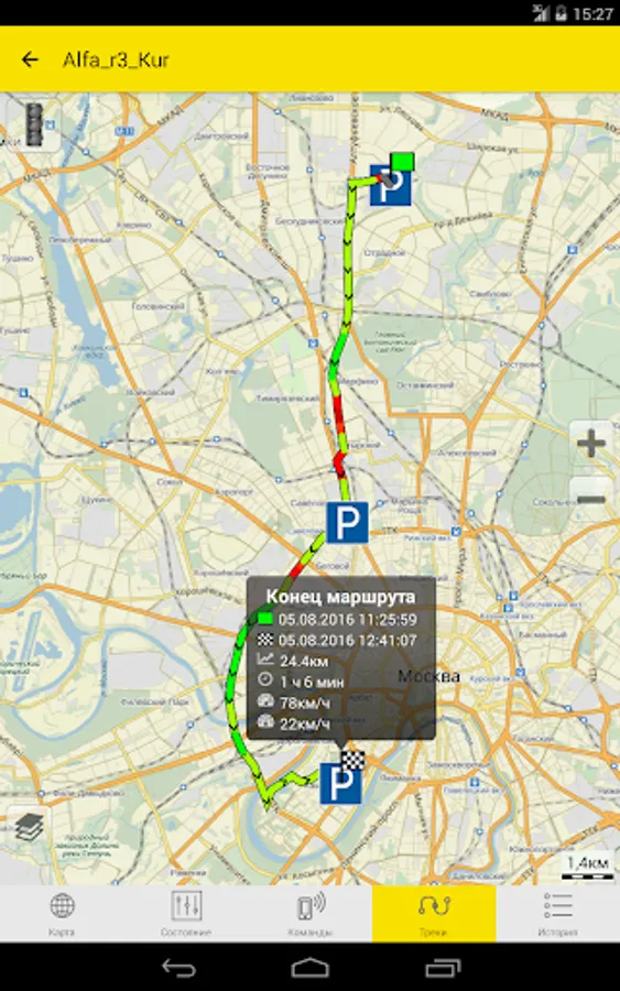 - Construction of motion tracks for arbitrary intervals with the ability to display in different colors of the track the speed of the object on the site. The ability to display the track with points on the map and remove points with approximate LBS coordinates. Display by icons the point of the beginning and end of the track, as well as parking places with an indication of their duration.