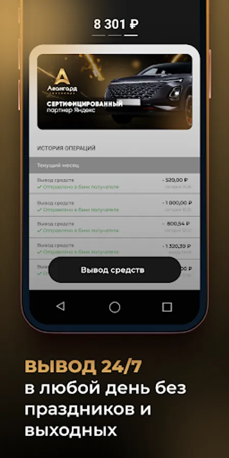 ⁃ withdrawal of funds without restrictions, 24/7 to any card through your mobile application