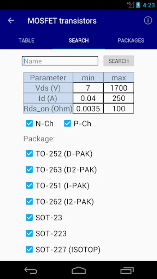 - params of transistors (BJT, MOSFET, IGBT etc.) and their packages (without the pinout);
