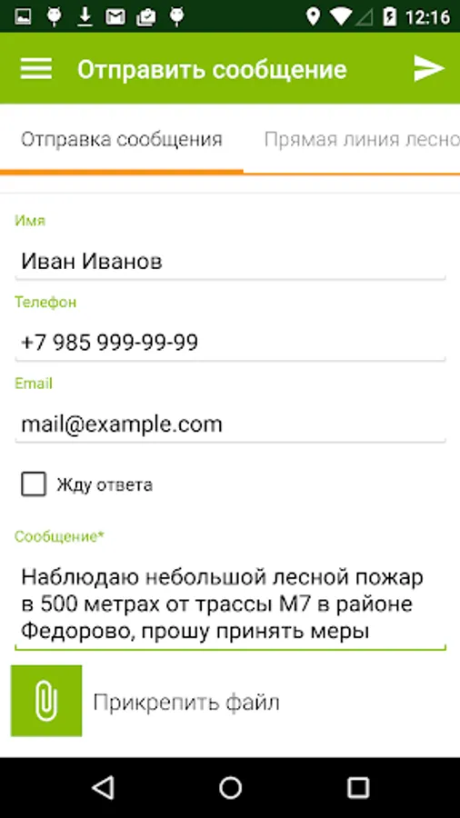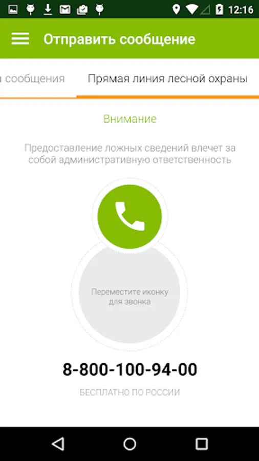 You can quickly and easily call the hot line wood protection, or send a message on a chosen topic, having attached thereto the photo and specifying coordinates scene. All sent messages you can view in a journal.