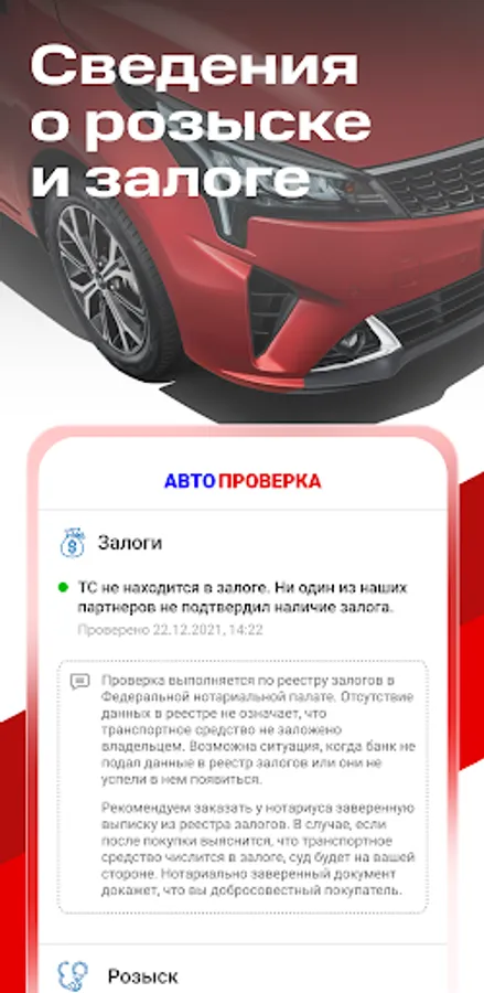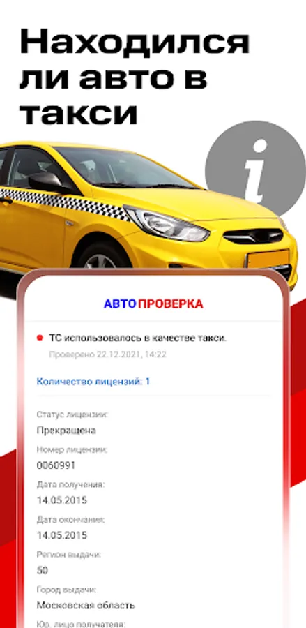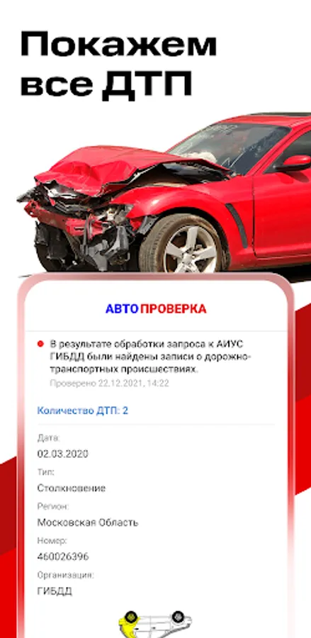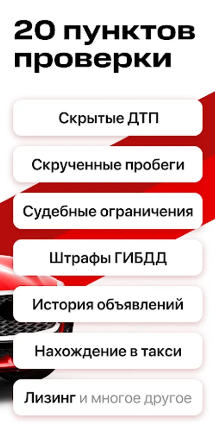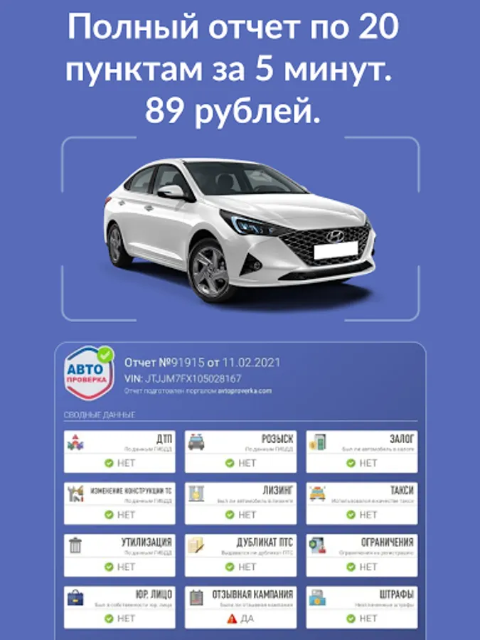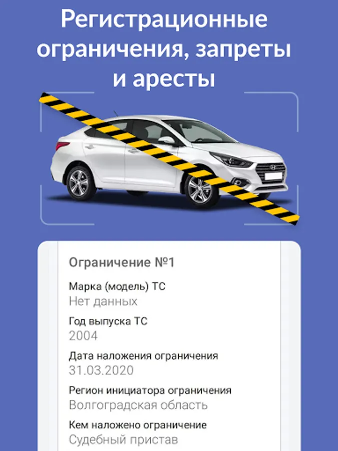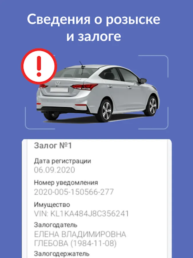 We have combined many official databases in the application, such as the database of the traffic police, the Ministry of Internal Affairs of the Russian Federation, the FSSP, the TRP, the EAISTO, the PCA, the Notary Chamber, the Taxi Register and other sources.
