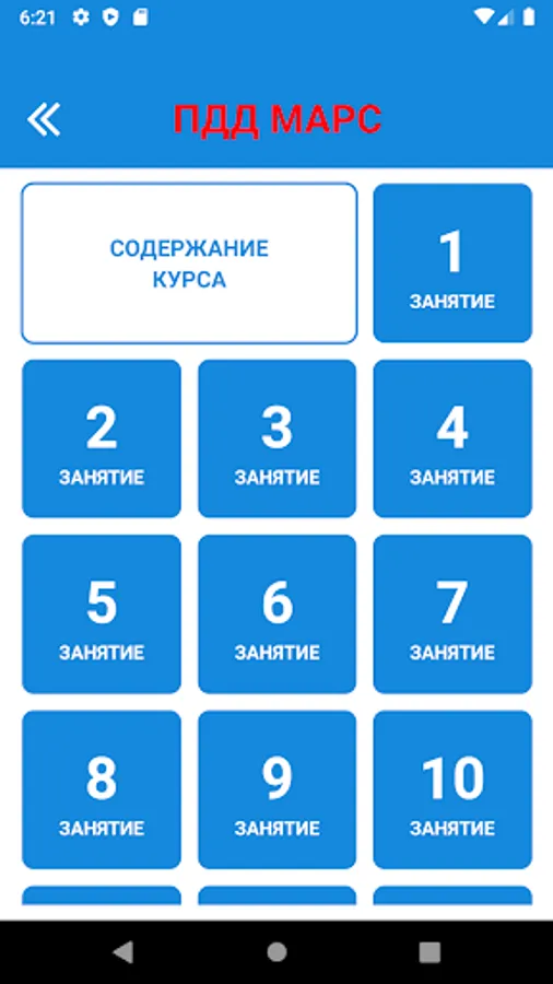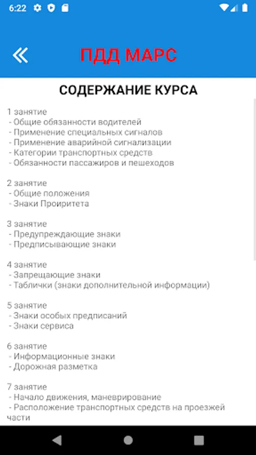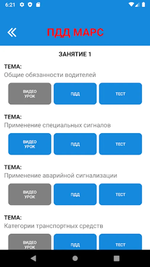 Все темы ПДД разложены на 13 занятий. В каждом занятии по каждой теме есть видеоурок, конспект, и официальный текст ПДД с картинками.