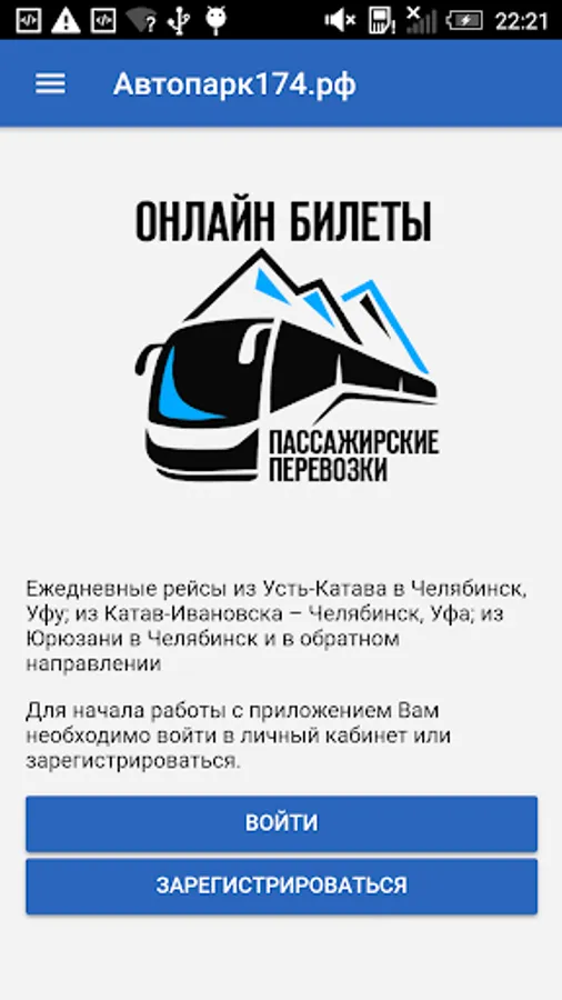 Description text of the application for the store: “The Autopark174.rf application will help you simply and safely purchase a ticket for daily flights to directions from Ust-Katav to Chelyabinsk, to Ufa; from Katav-Ivanovsk - Chelyabinsk, to Ufa; from Yuryuzani to Chelyabinsk and in the opposite direction.
